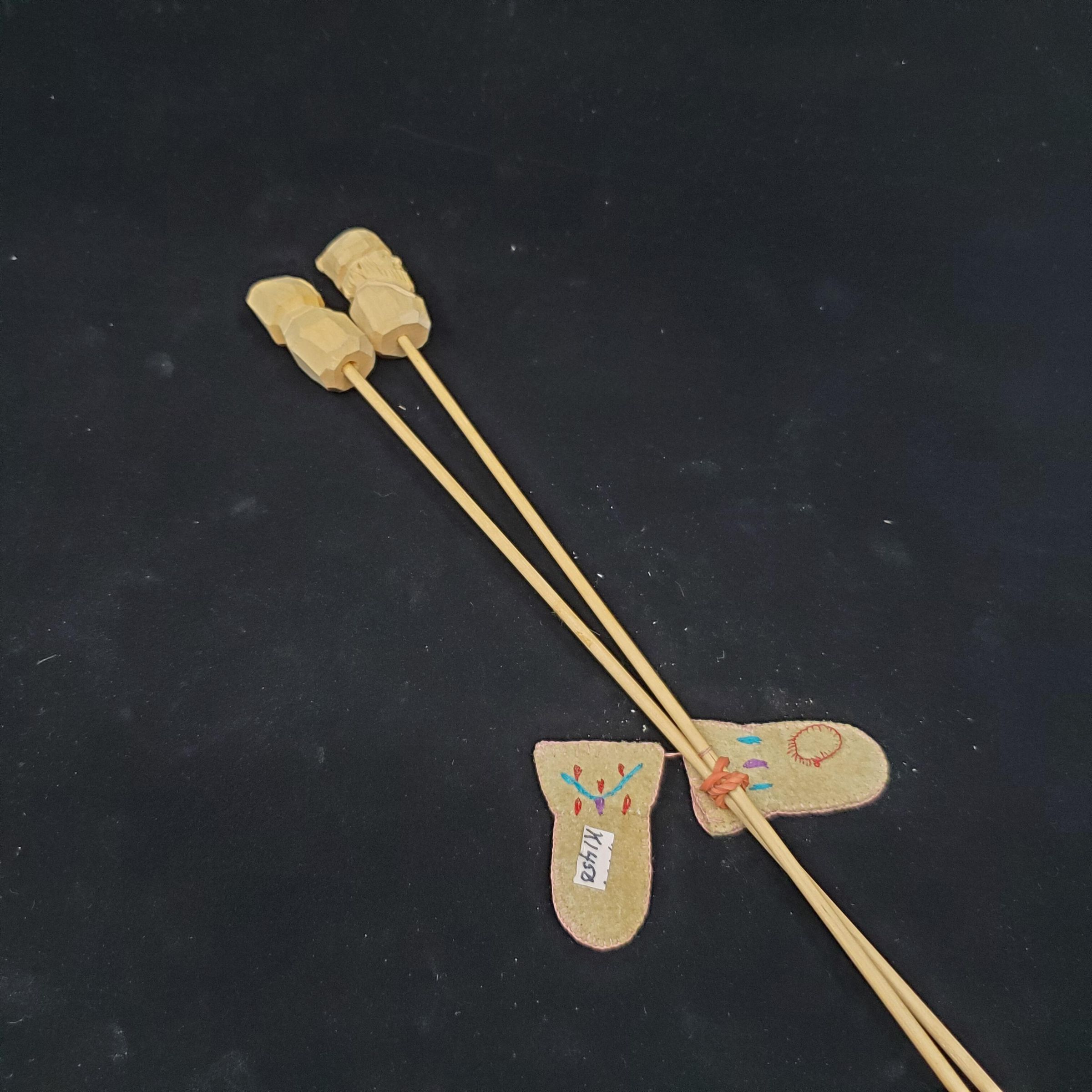 Small tan leather knitting needle guards in shape of mitts with thumbs. Embroidery around outside in pink, thumb in red. Other colours used in design - purple, blue.