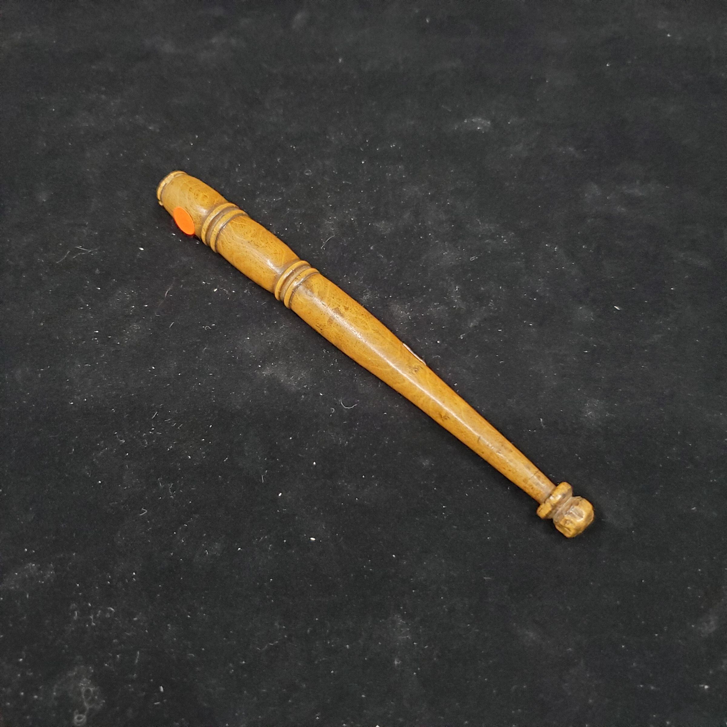 Wooden knitting sheath. Medium brown colour with hole in larger end. Some wear nicks at needle end.