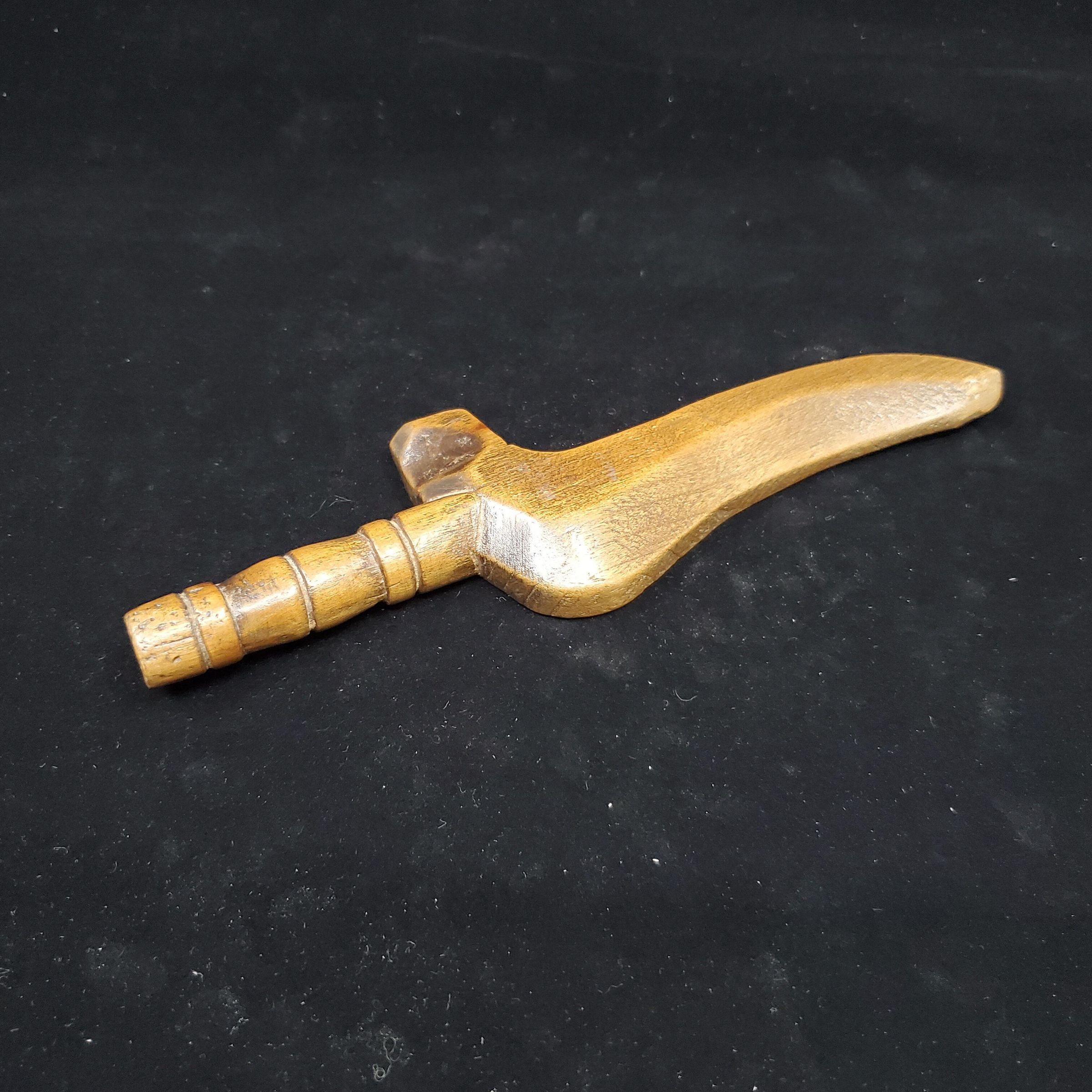 Wooden knitting needle sheath in the form of a goose wing. Mid brown coloured wood with a few nicks from wear. Hand carved.