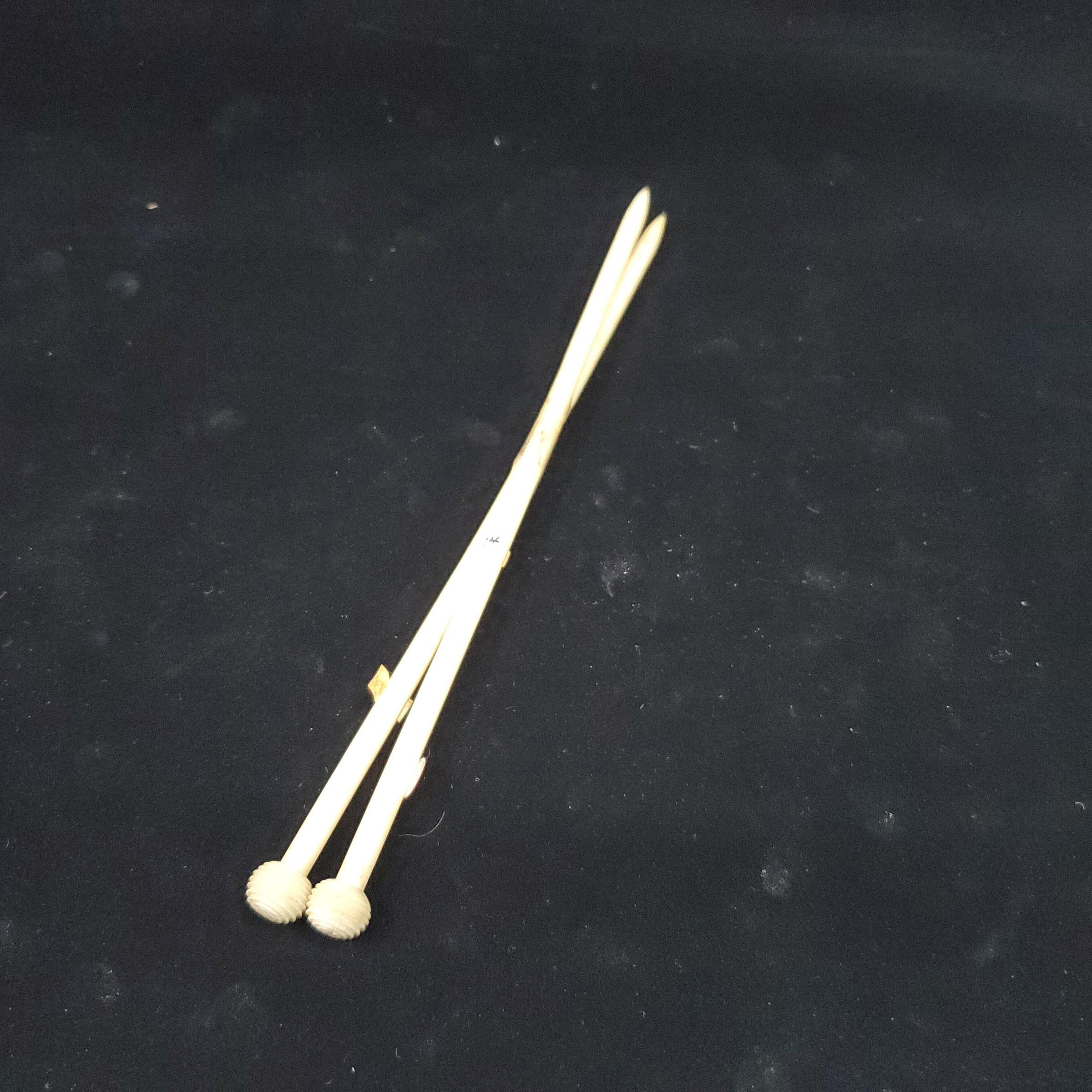 Bone or ivory knitting needles, short, with round spiral tops.