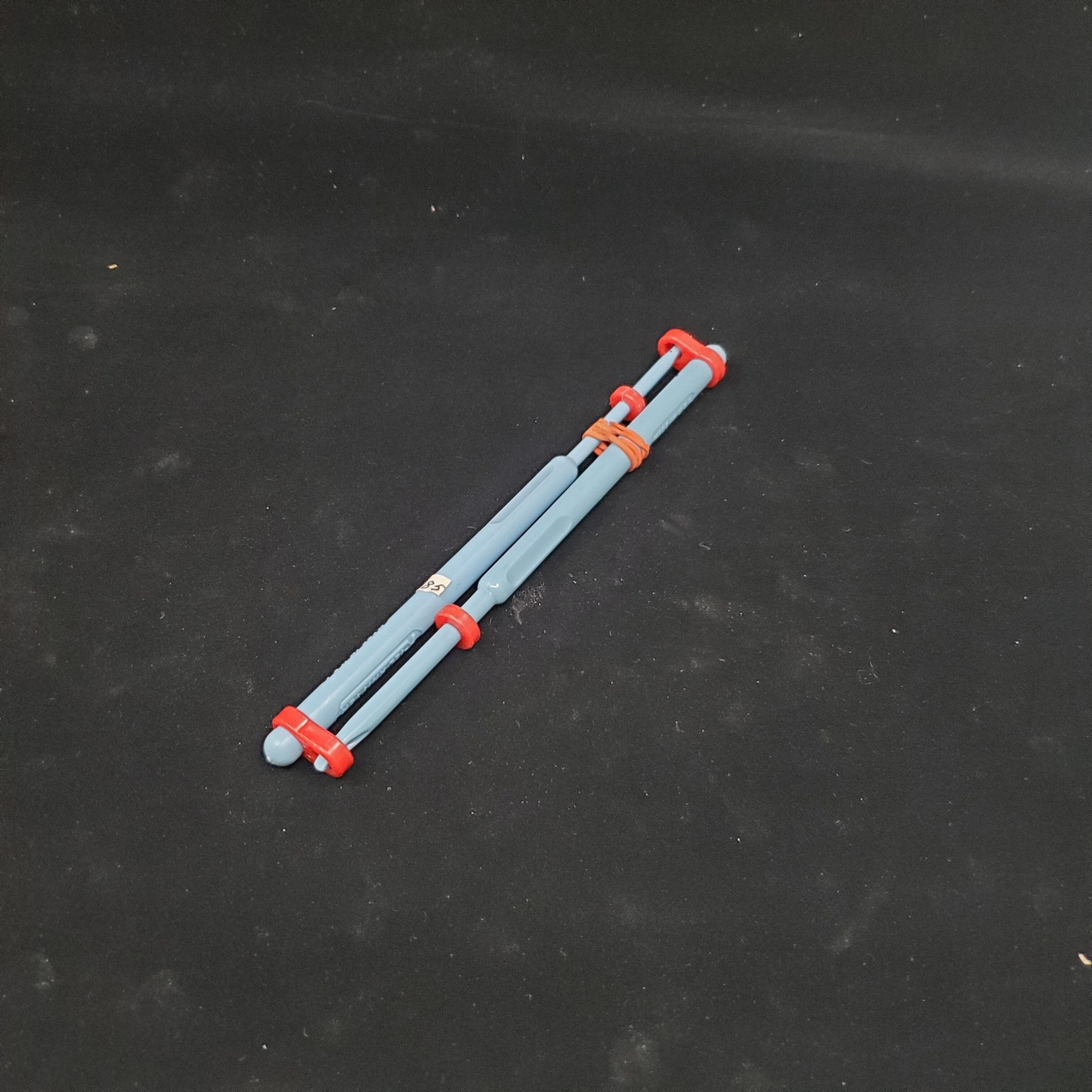 Pair of blue plastic needles with a pointed eye at one end.Red plastic holders at one end. Red plastic ring at each end. Stamped ÒMade in U.S.A.Ó and ÒK Tel KnitterÓ
