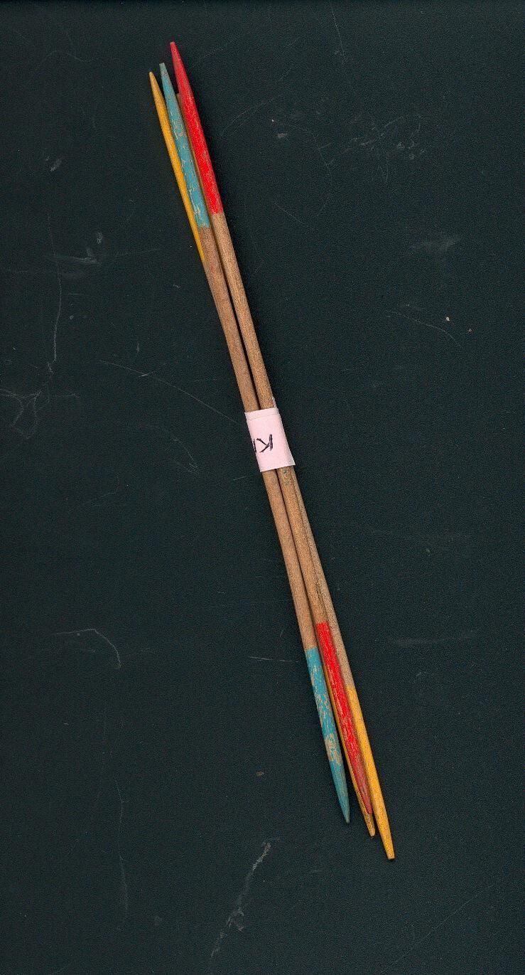 Short wooden, set of 4, knitting needles. Double pointed ends. All ends painted, 2 yellow, 1 red, 1 blue.