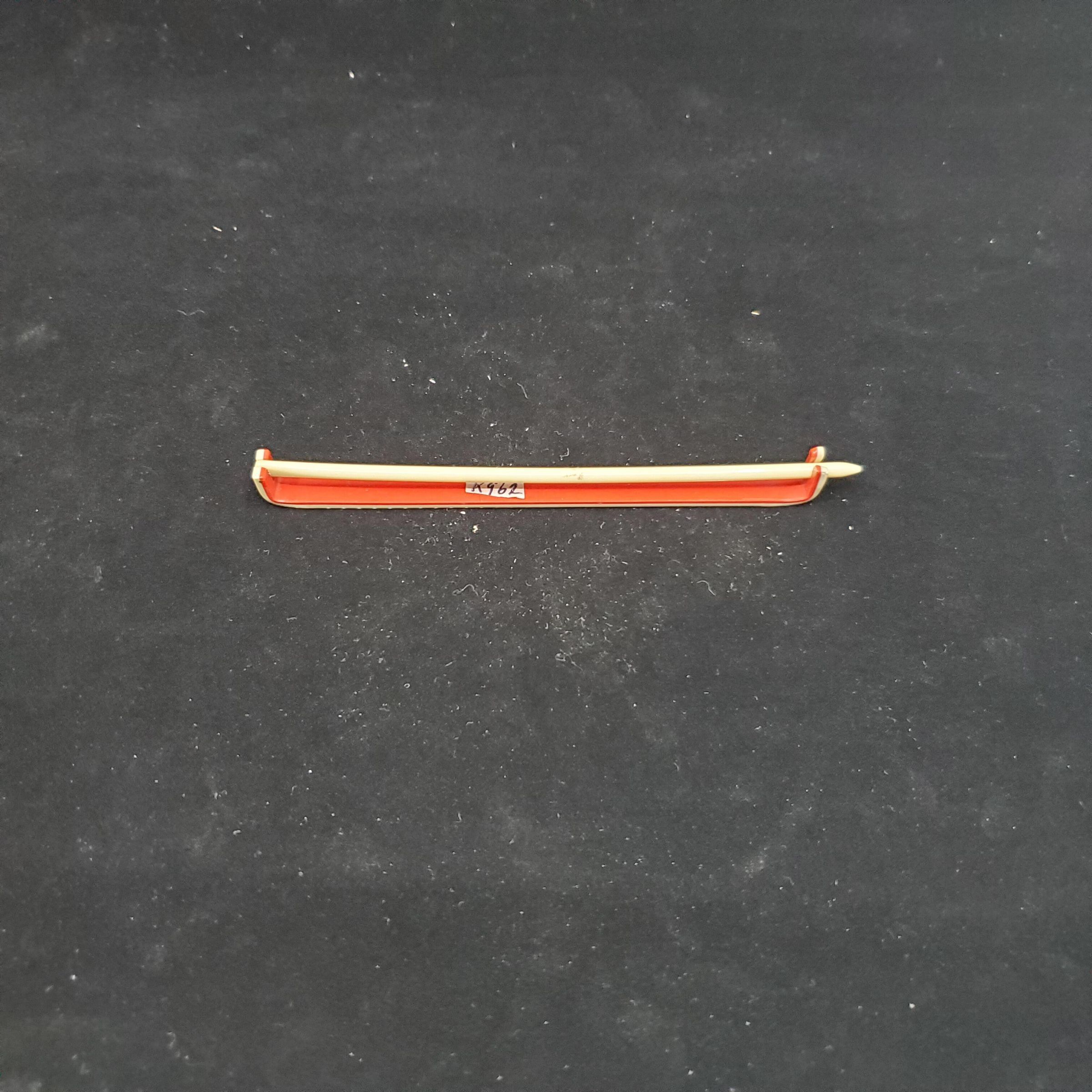 Cream and red coloured plastic stitch holder and measure. Measure marked in inches Brass stud in holder.