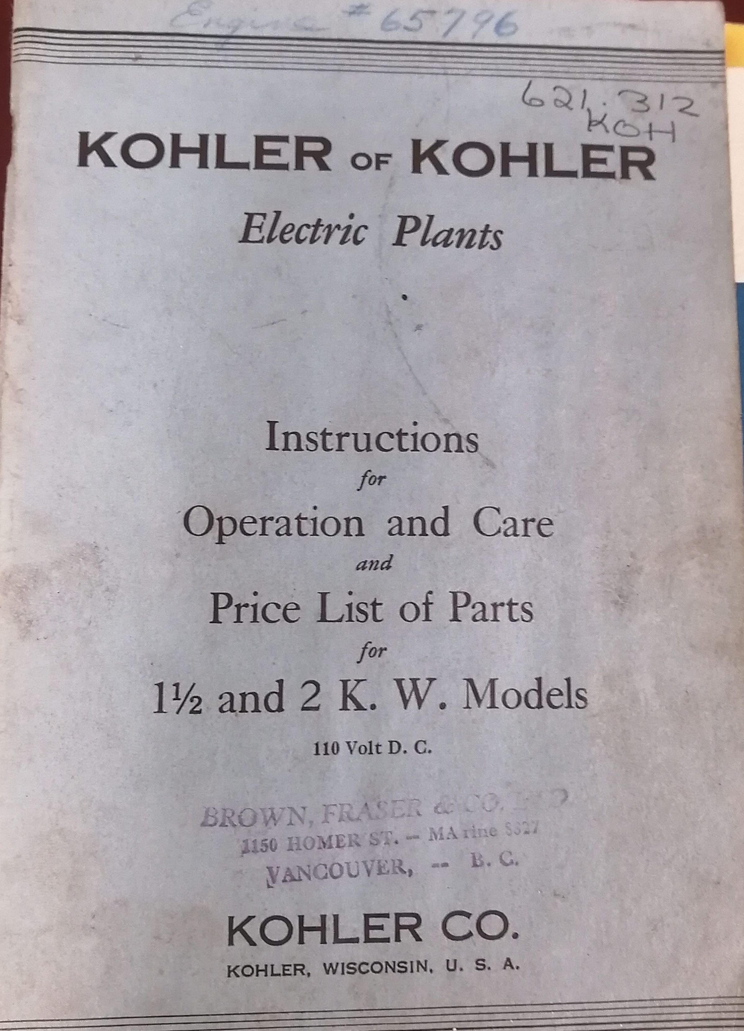 Kohler of Kohler. Electric plants. Instructions for operation and care and price list of parts for the 1 1/2 and 2 K.W. models 110 volt D.C.