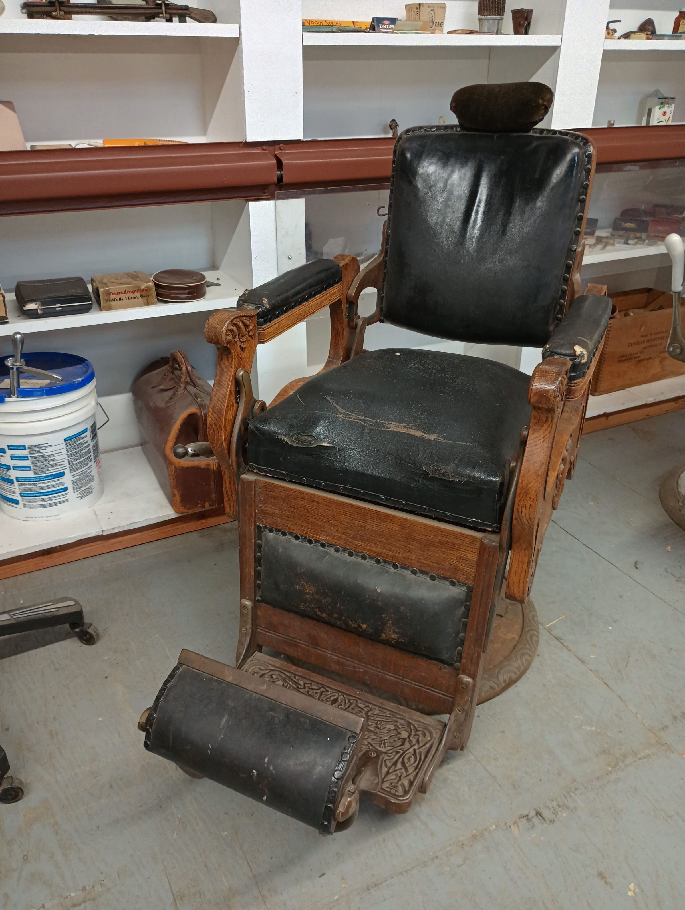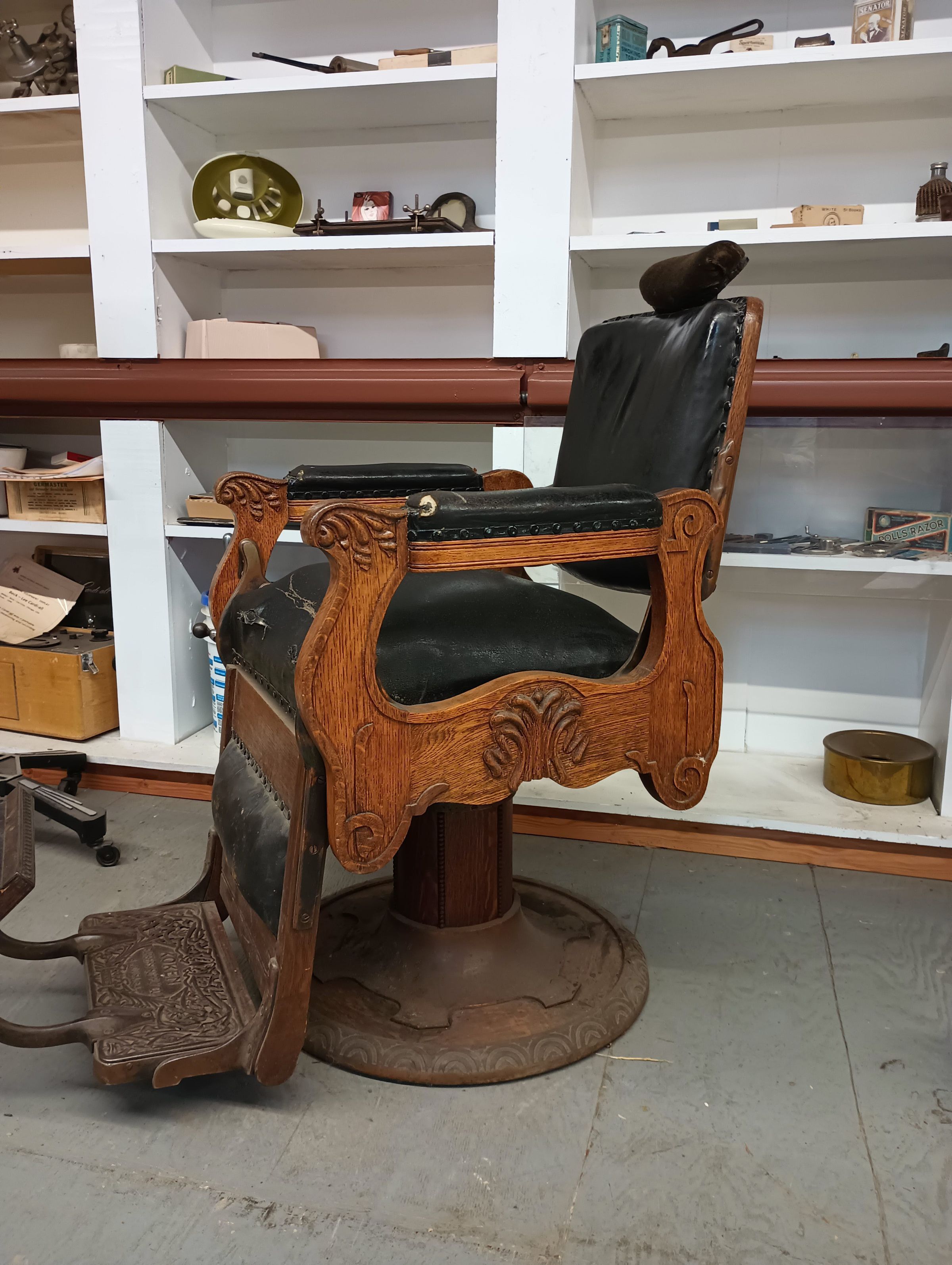 Carved wood and leather barber's chair made by Koken Barber Supply Company.