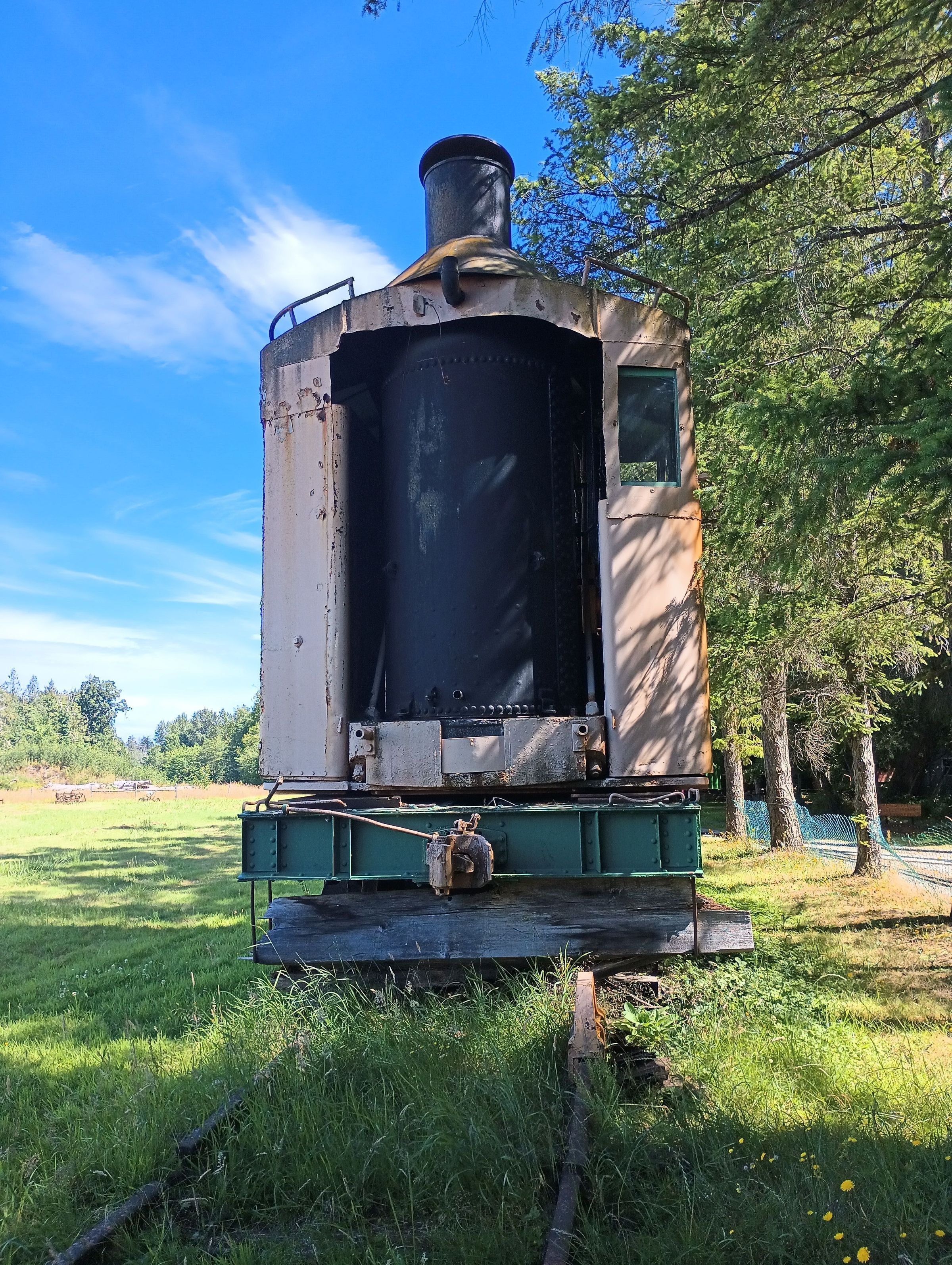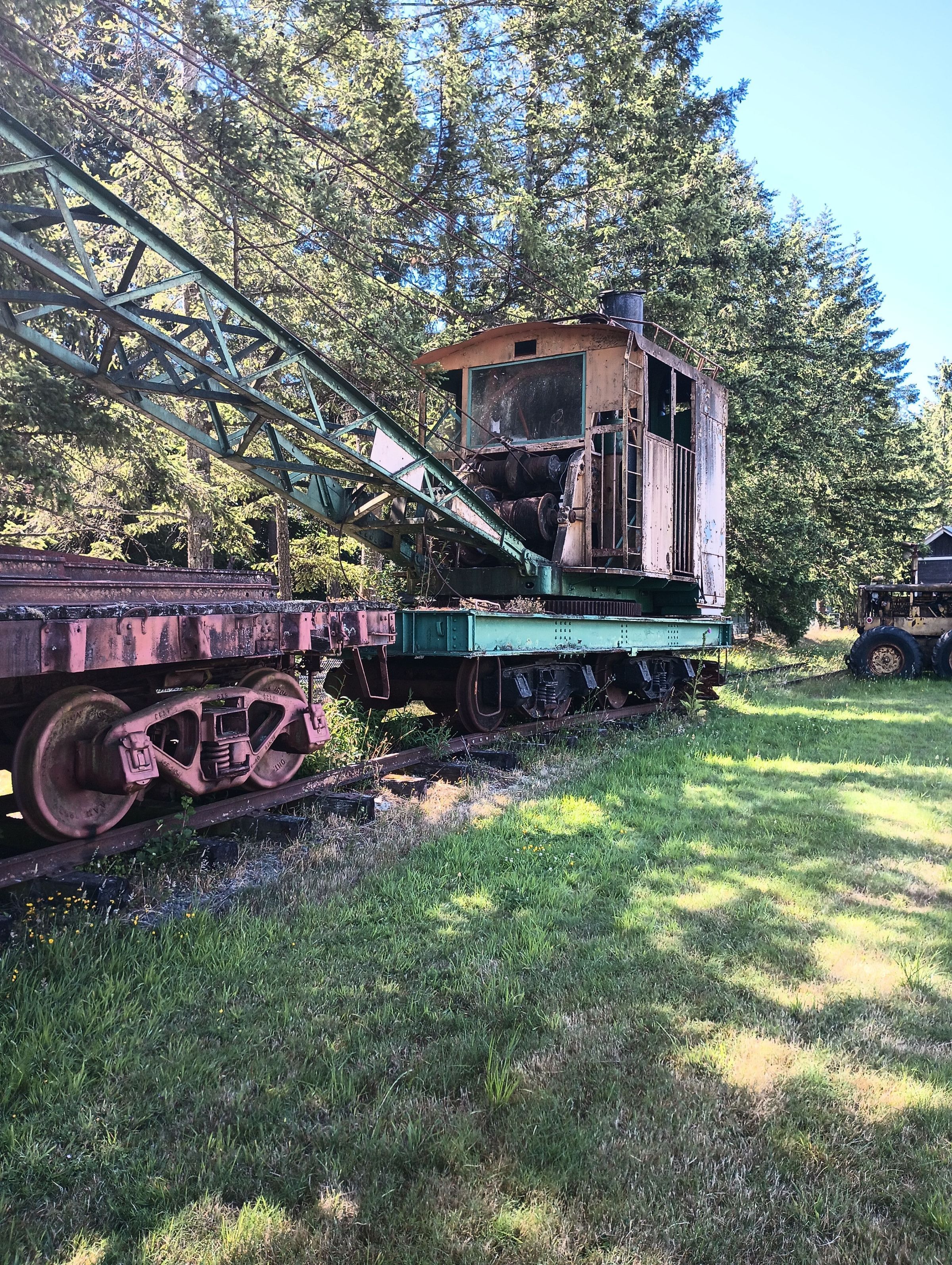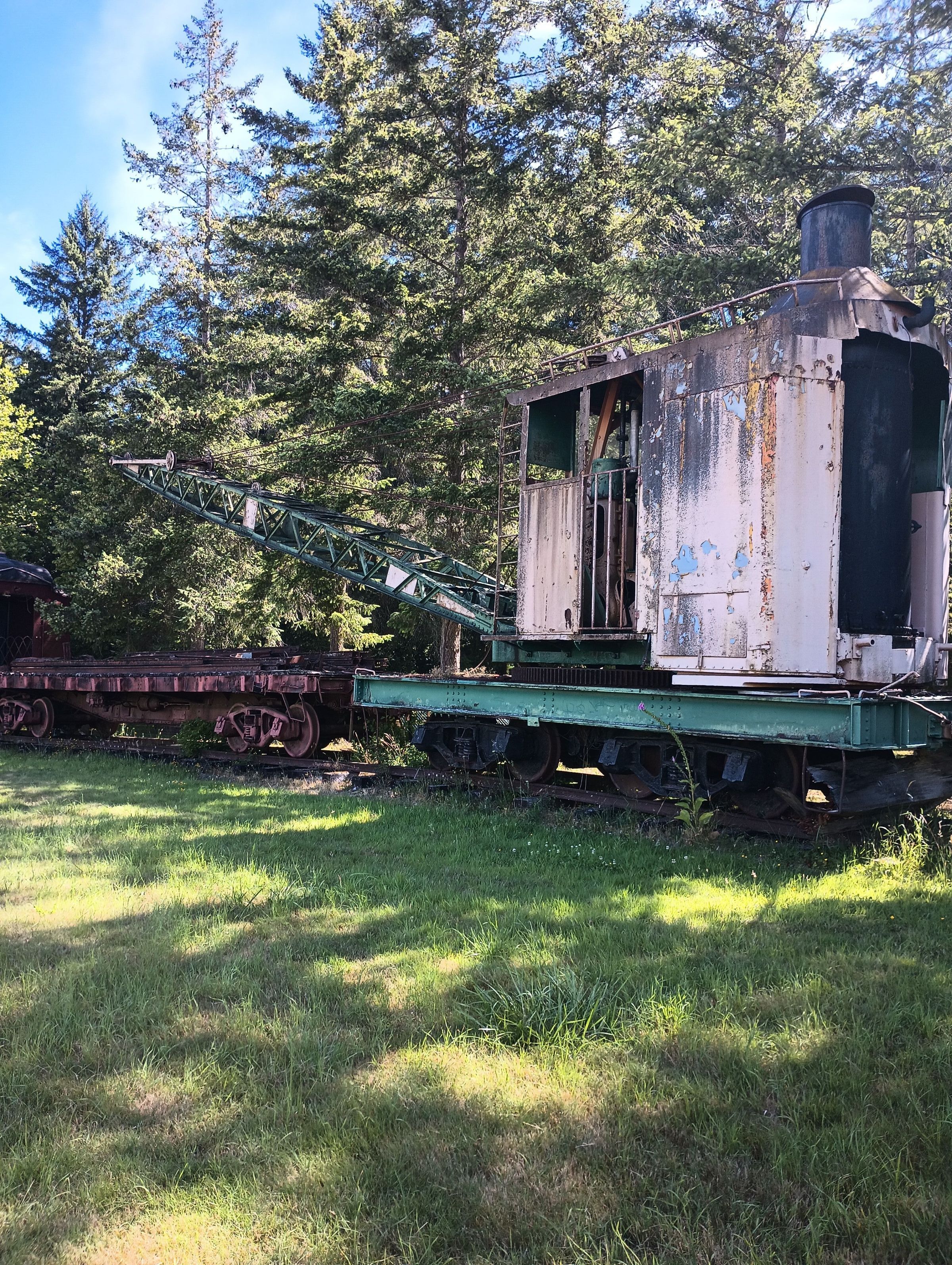 Link belt steam locomotive crane mounted on a railcar. Built around 1902. Part of the production line for BC Forest Products until 1970.