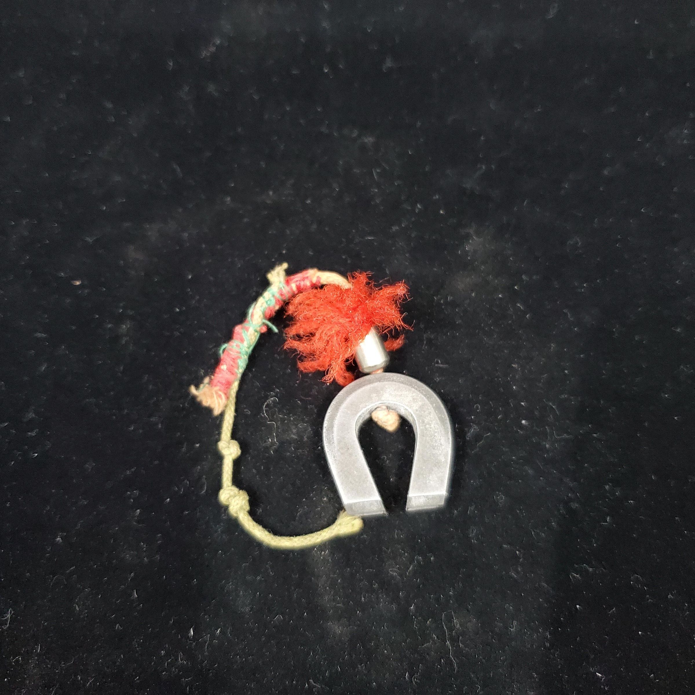Magnet in the shape of a horseshoe, Cord attached at top with red tassel - for hanging. Stamped on hrseshoe ÒMade in EnglandÓ.`
