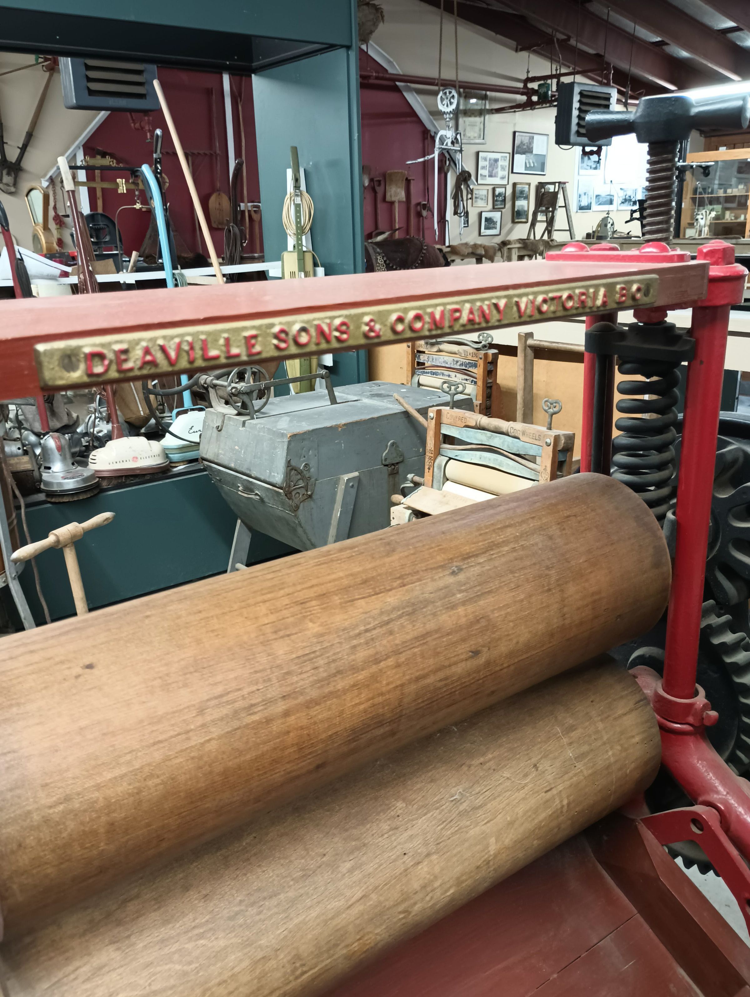 This mangle was used or sold by Deaville Sons and Company Victoria B.C. William Bailey Deaville immigrated from England in 1898 and established a grocery store on Hillside avenue, Victoria B.C. The business was sold in about 1917.