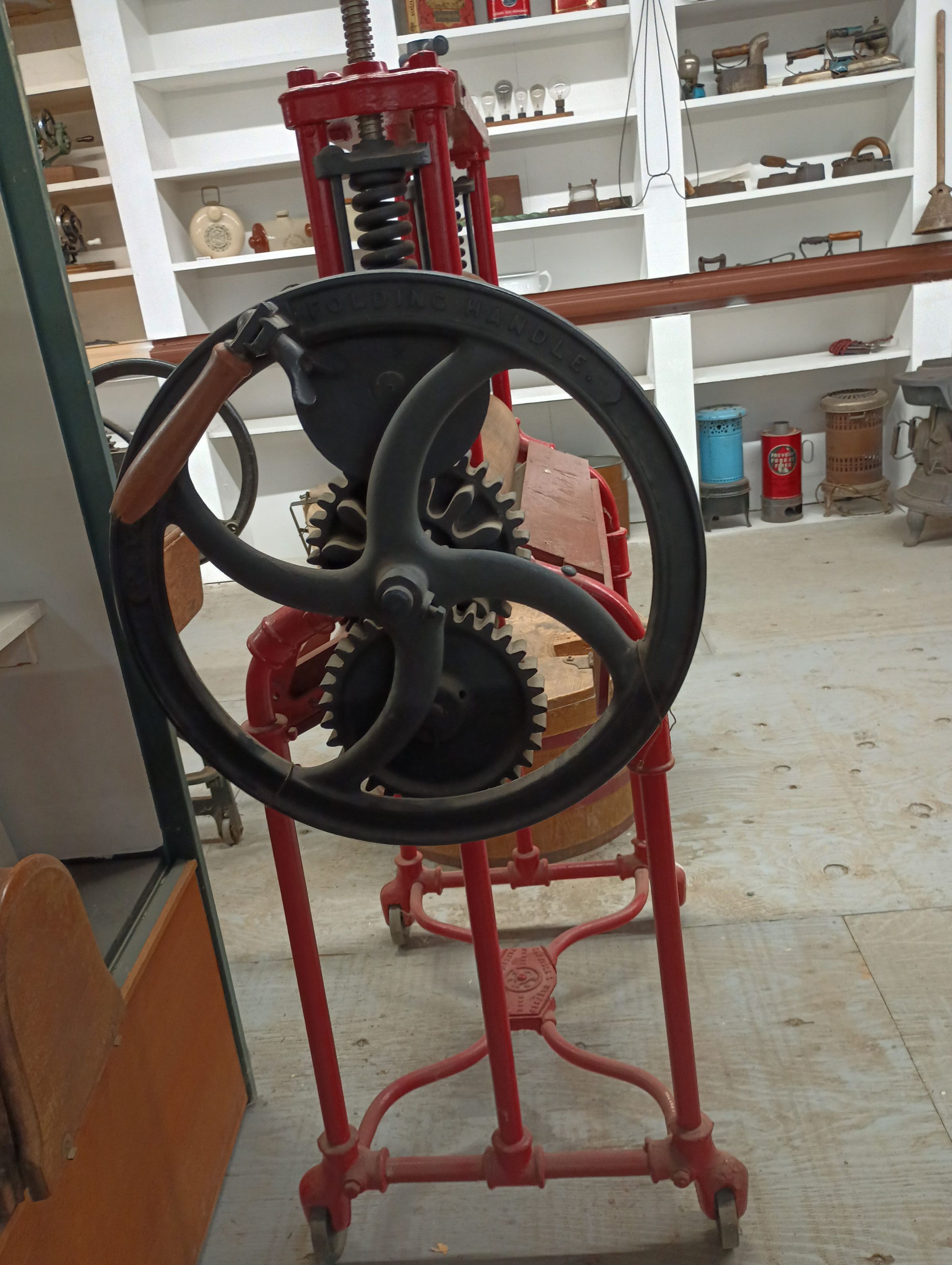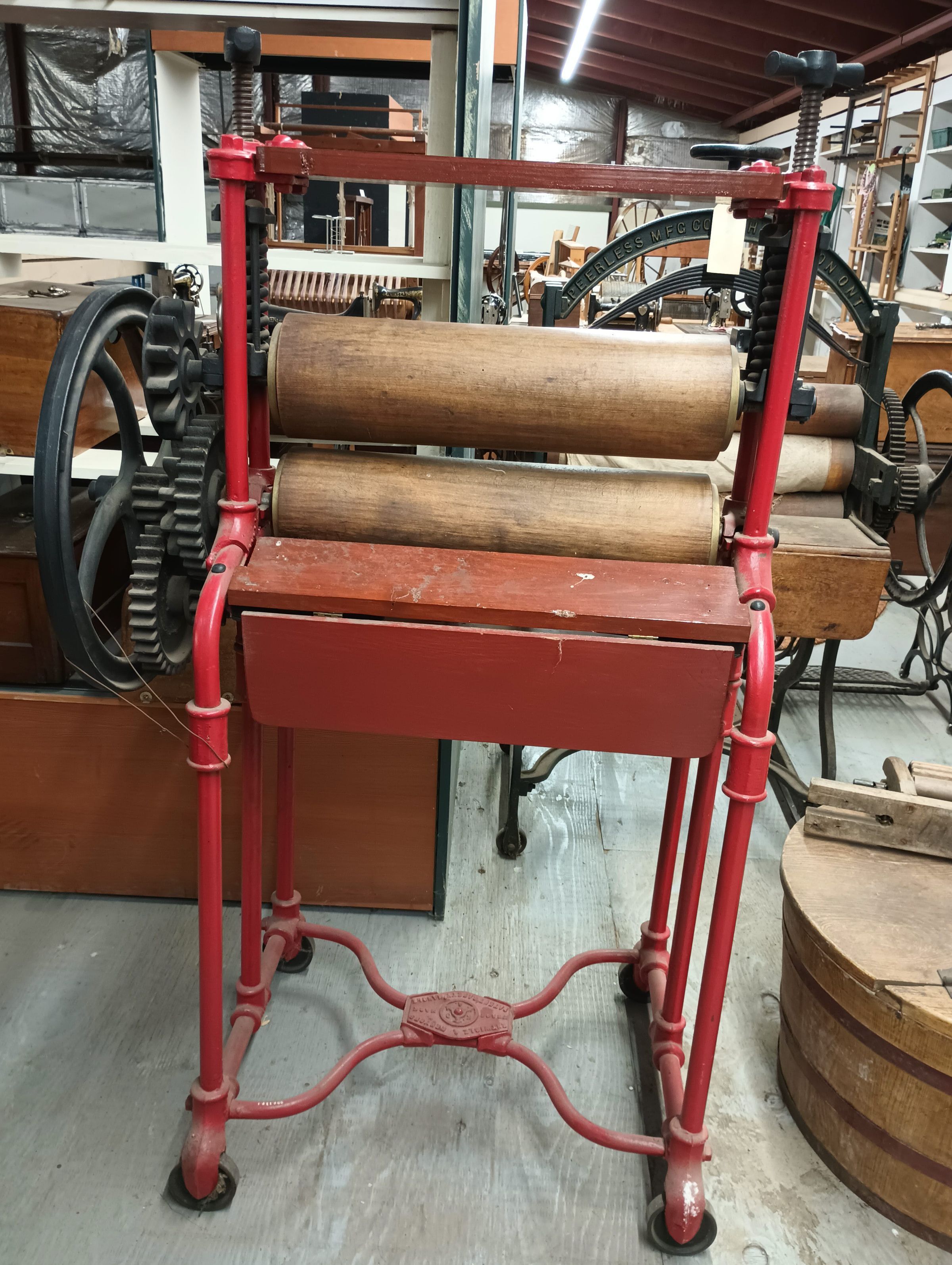 Red and black wood and metal hand cranked laundry press with wooden rollers.Use