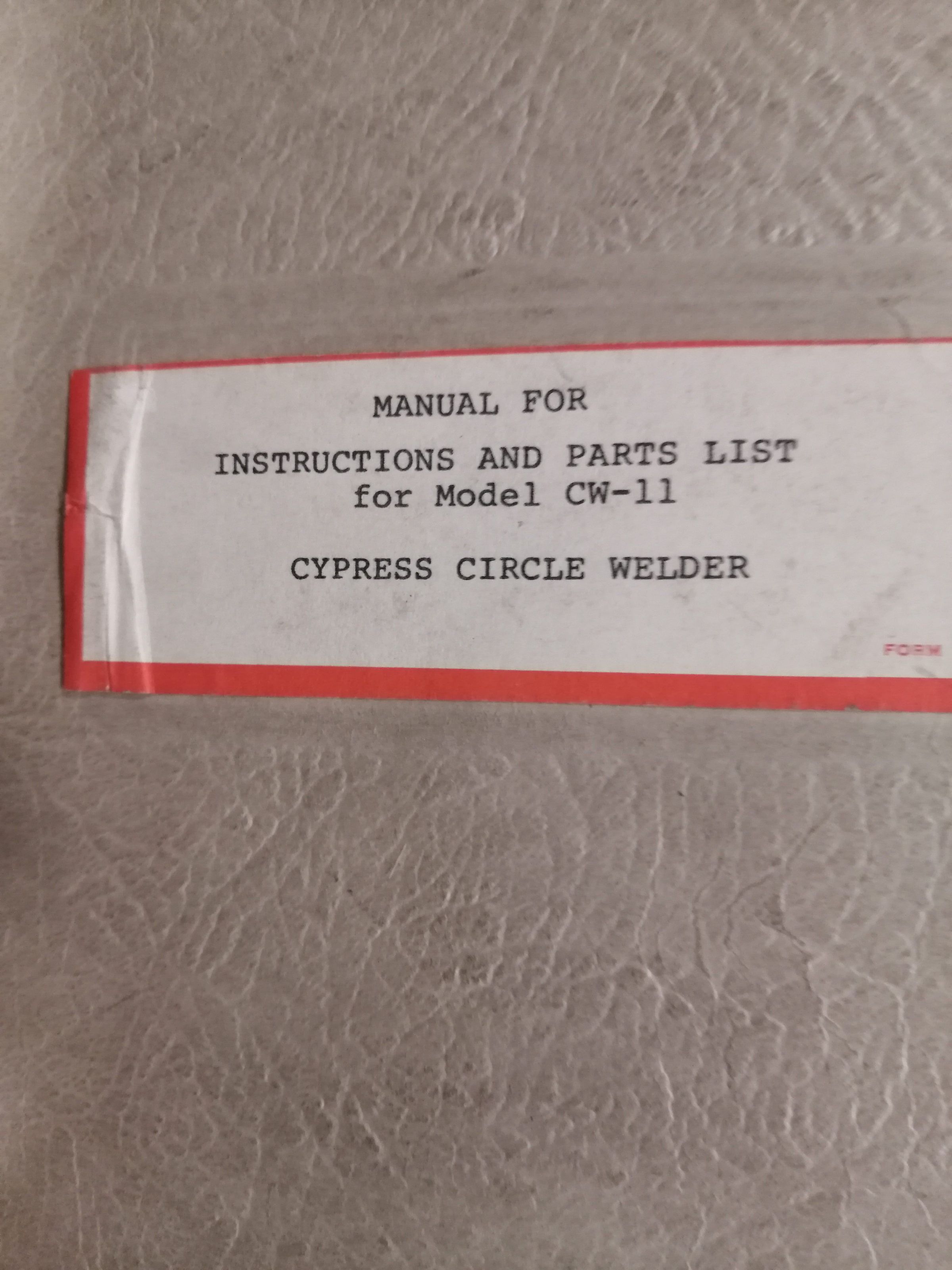 Manual for instructions and parts list for model CW-11. Cypress circle welder