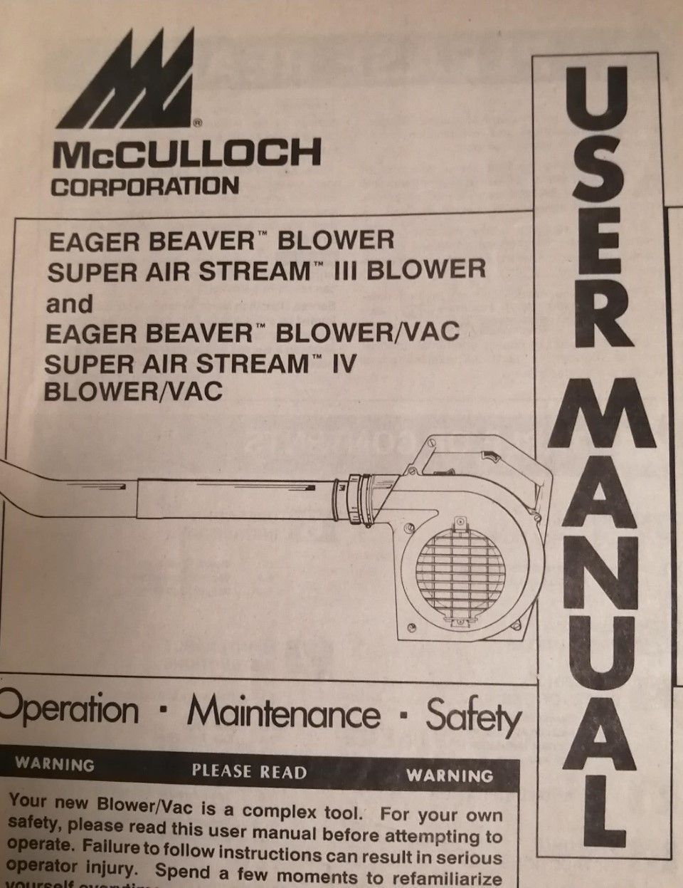 McCulloch corporation. Eager beaver " blower super air stream" III blower and eager beaver "blower/vac super air stream" IV blower/vac.
