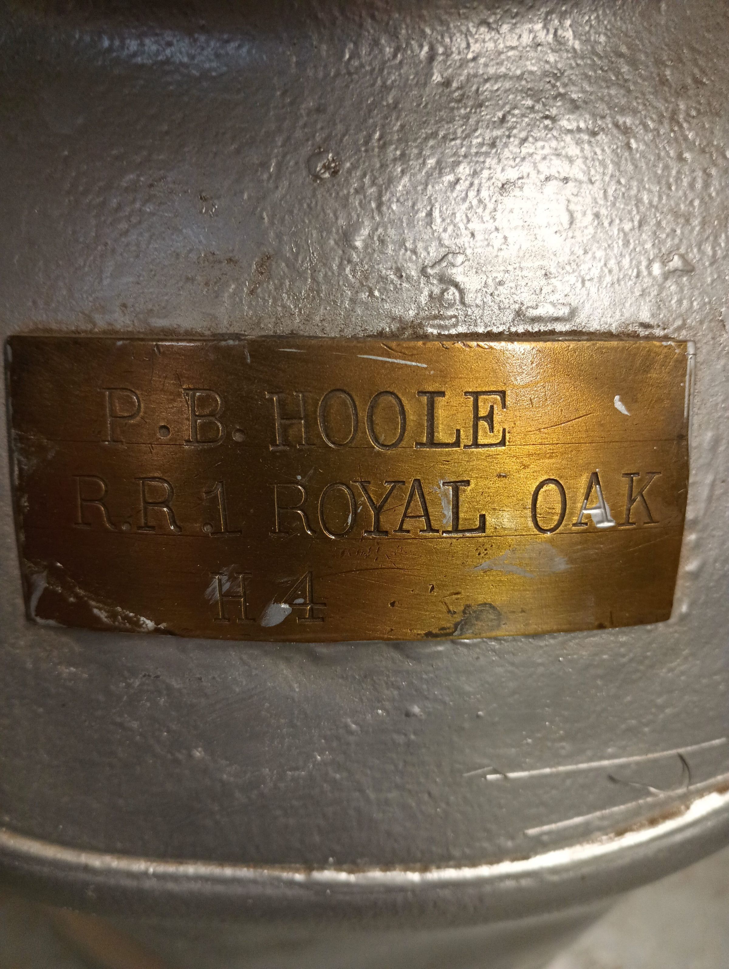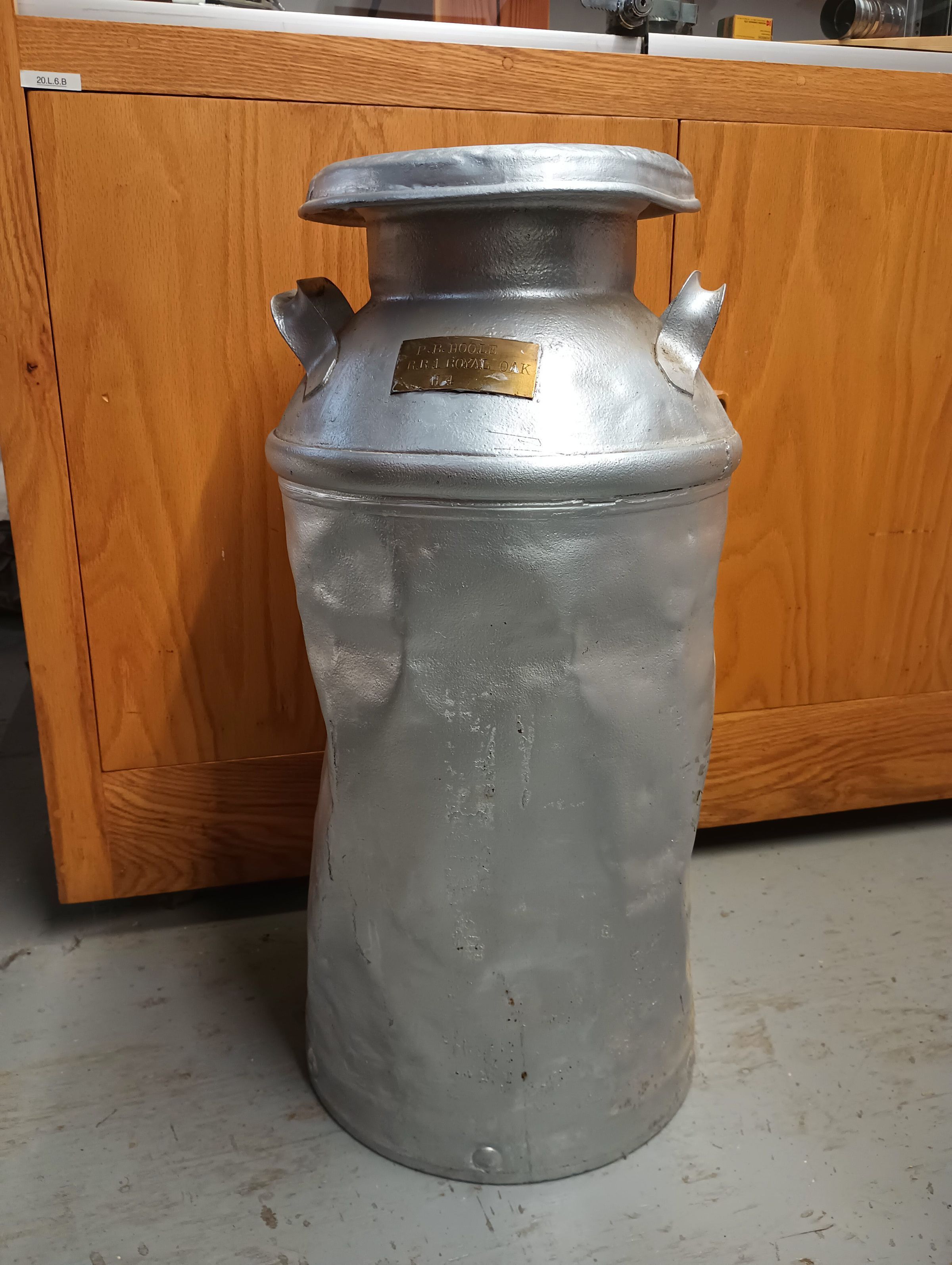 Milk can with brass label 'P.B. Hoole R.R. 1 Royal Oak'.
