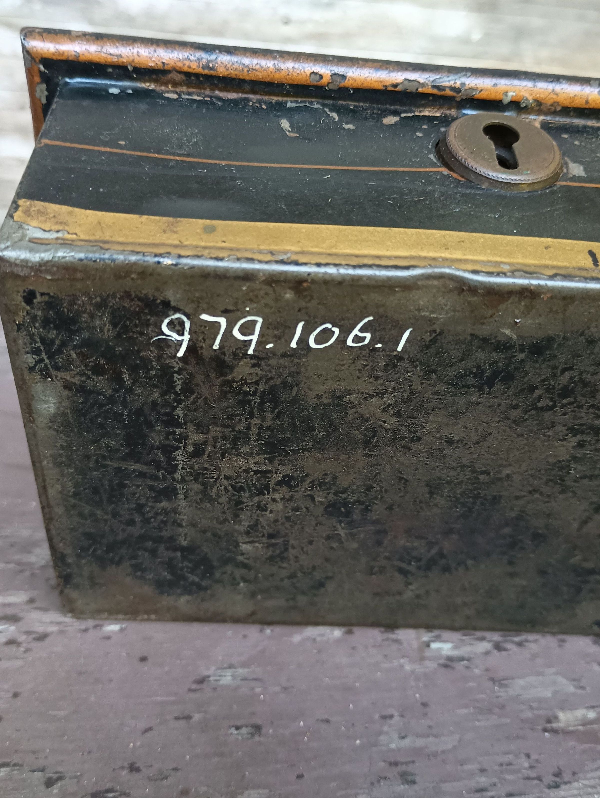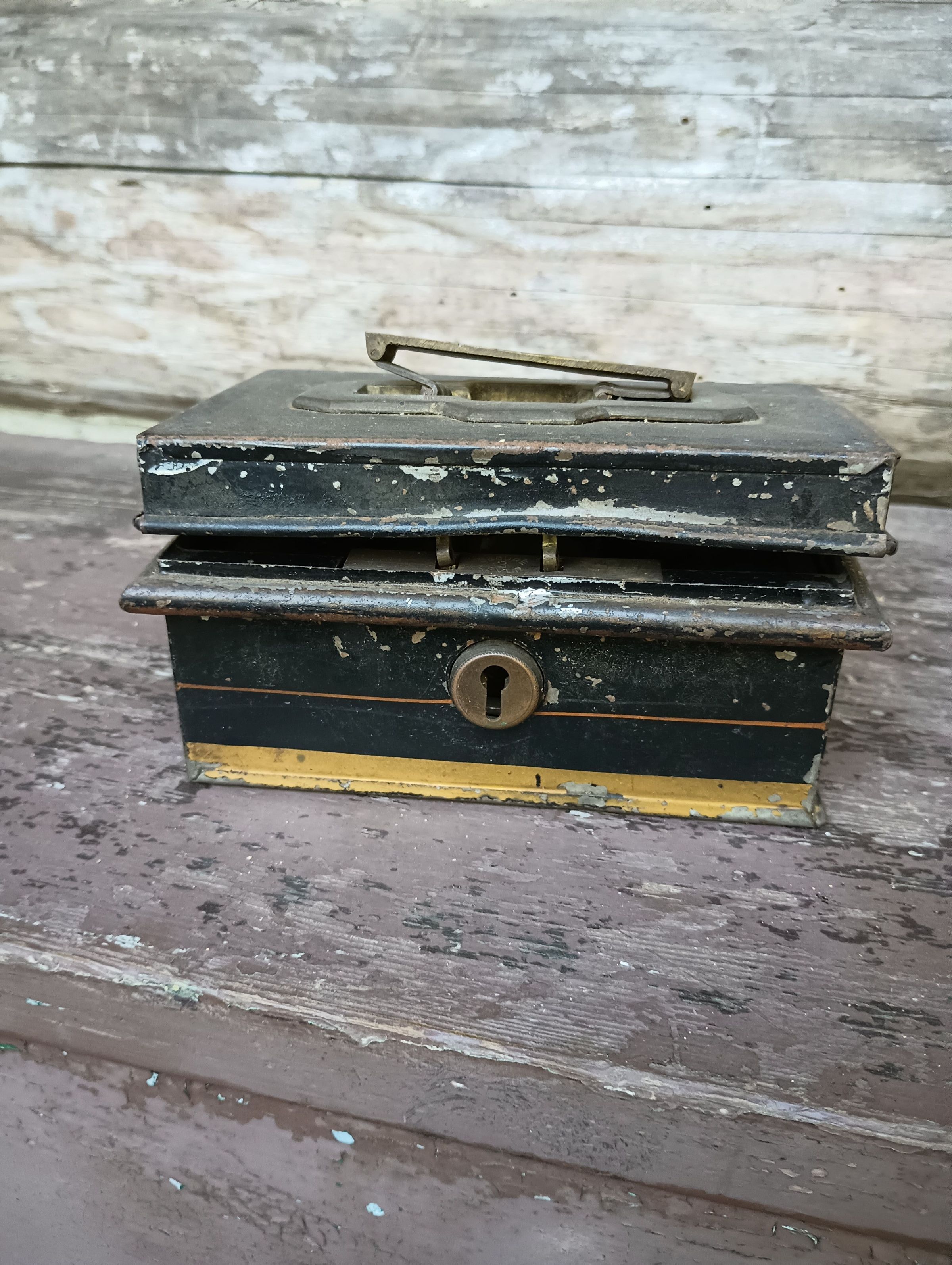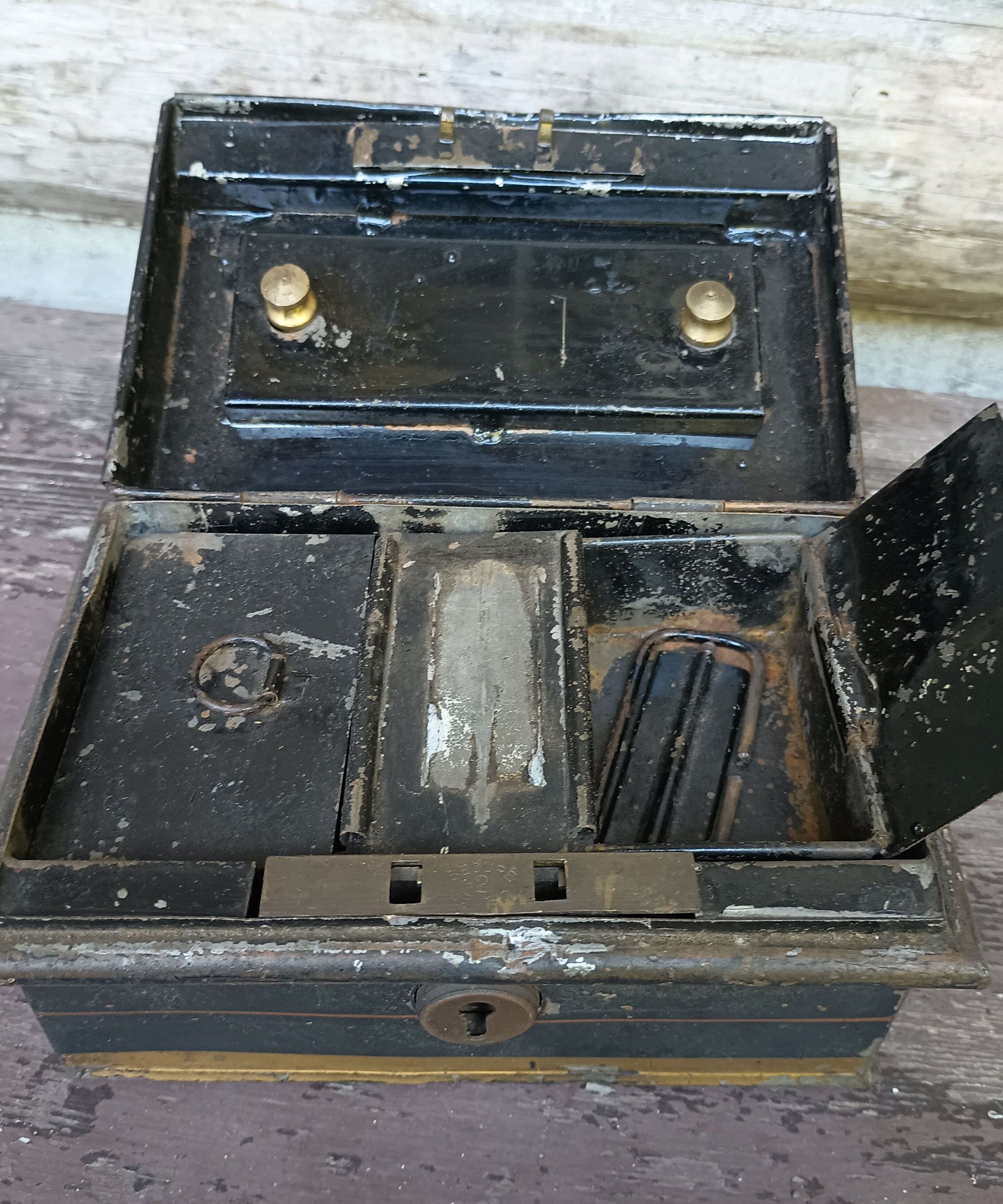 Small black metal box with internal compartments, handle and lock.
