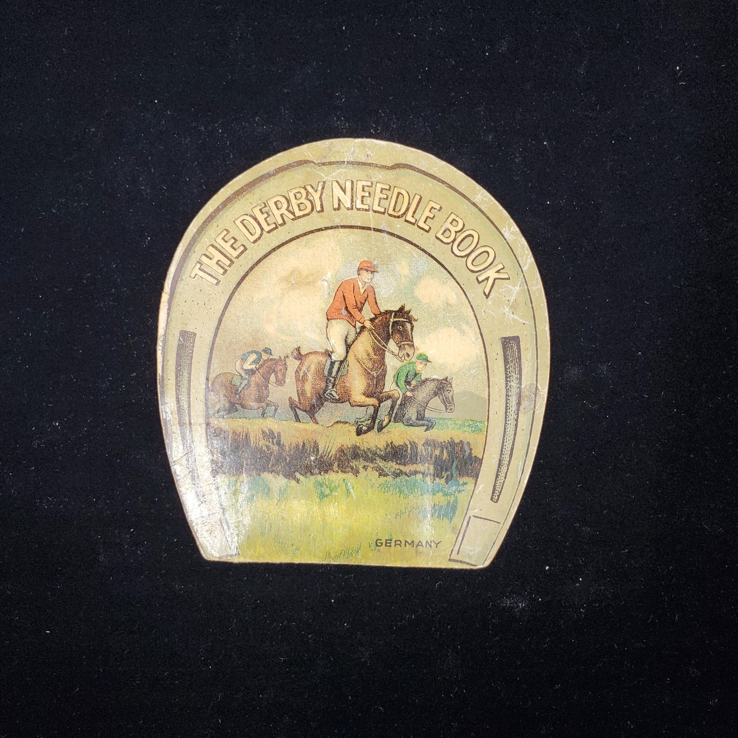 Cardboard needle case in shape of horseshoe with a coloured hunting scene both back and front. U.S.A. flag in one scene. One scene called The Winner. ÒThe Derby Needle BookÓ around curve of horse shoe. Back cover also has Germany stamped on it. Inside needle pkts. - 3 only, spaces for 5 pkts plus singles. 2pkts. same brand, 3rd different