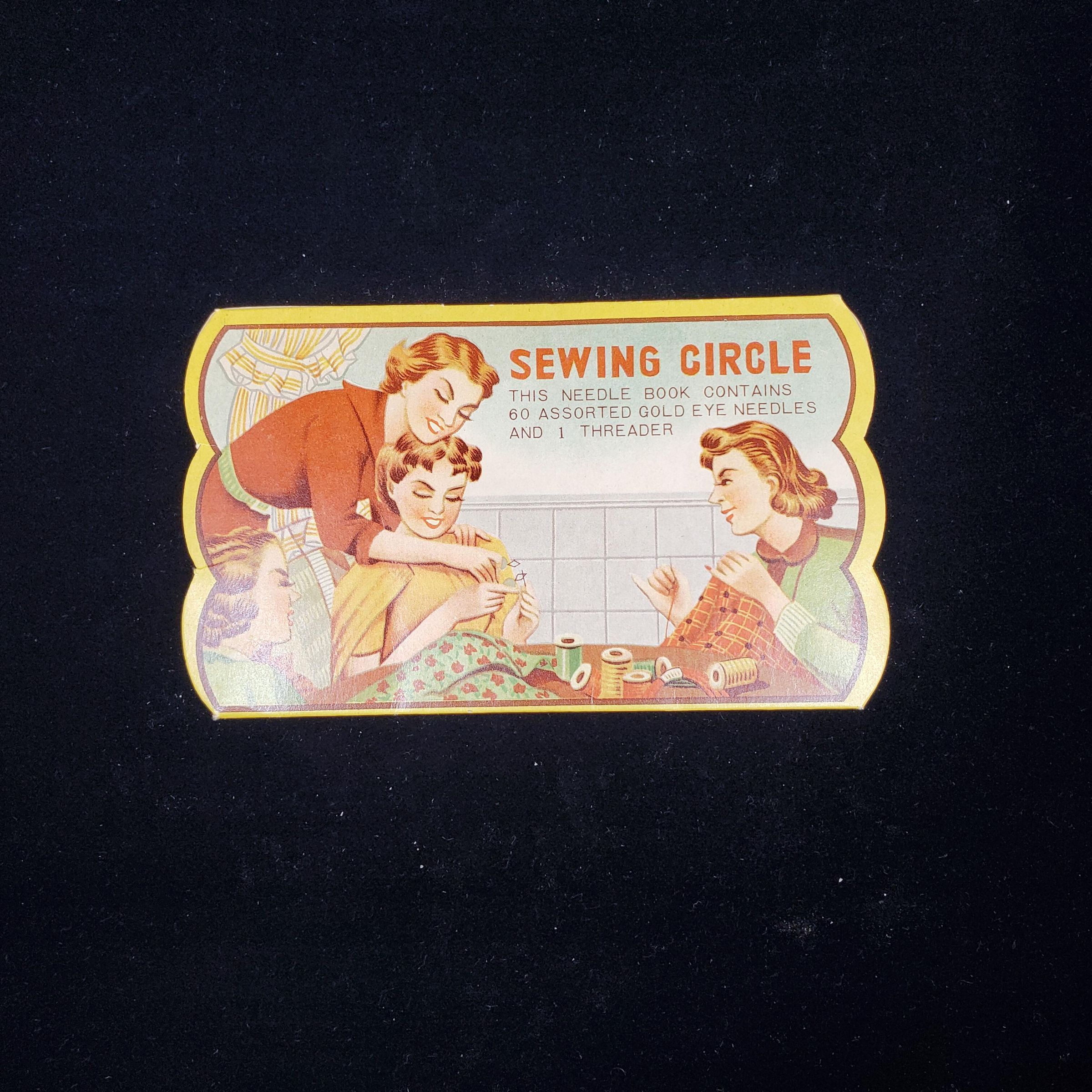 Cardboard needle case, made in Japan. Outside cover - 3 ladies sewing andÓSewing CircleÓ Inside 60 assorted gold eye needles and 1 threader. Also,inside paper from National TravelerÕs Life Company, who were giving these cases away.