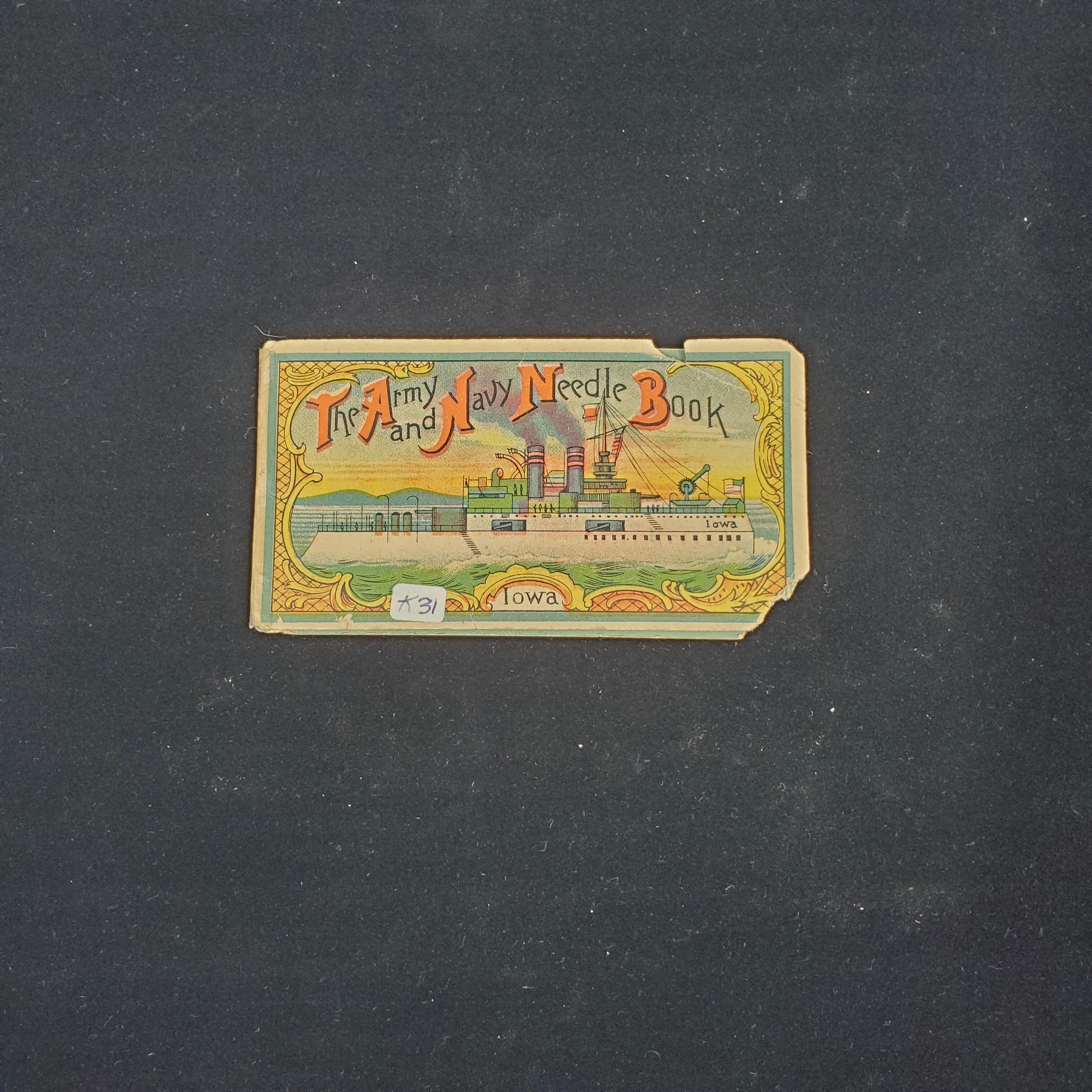 ÒThe Army and Navy Needle BookÓ Light weight coloured cardboard needle book with picture of the U.S. battleship ÒIowaÓ on front. Back cover has Bald Head Eagle. Inside places for needle packets. 3 packets of ÒSuperior Imperial Drilled Eyed Warranted Not To Cut in the eyeÓ Silver-steel Hardened in Oil.