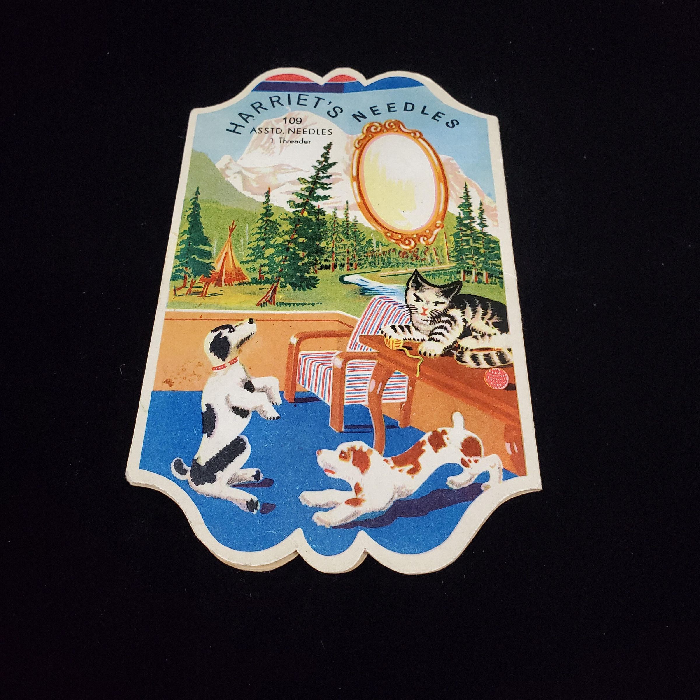 Cardboard Needle Case with coloured scene of cat, 2 dogs, inside house with outside scene of trees, tent, mountains. ÒHarrietÕs Needles 109 Asstd Needles 1 Threader Ò printed in black on outsde. Scene on back same.Inside 6 coloured foils with different sized needles and 1foil with needle threader, all on blue background.