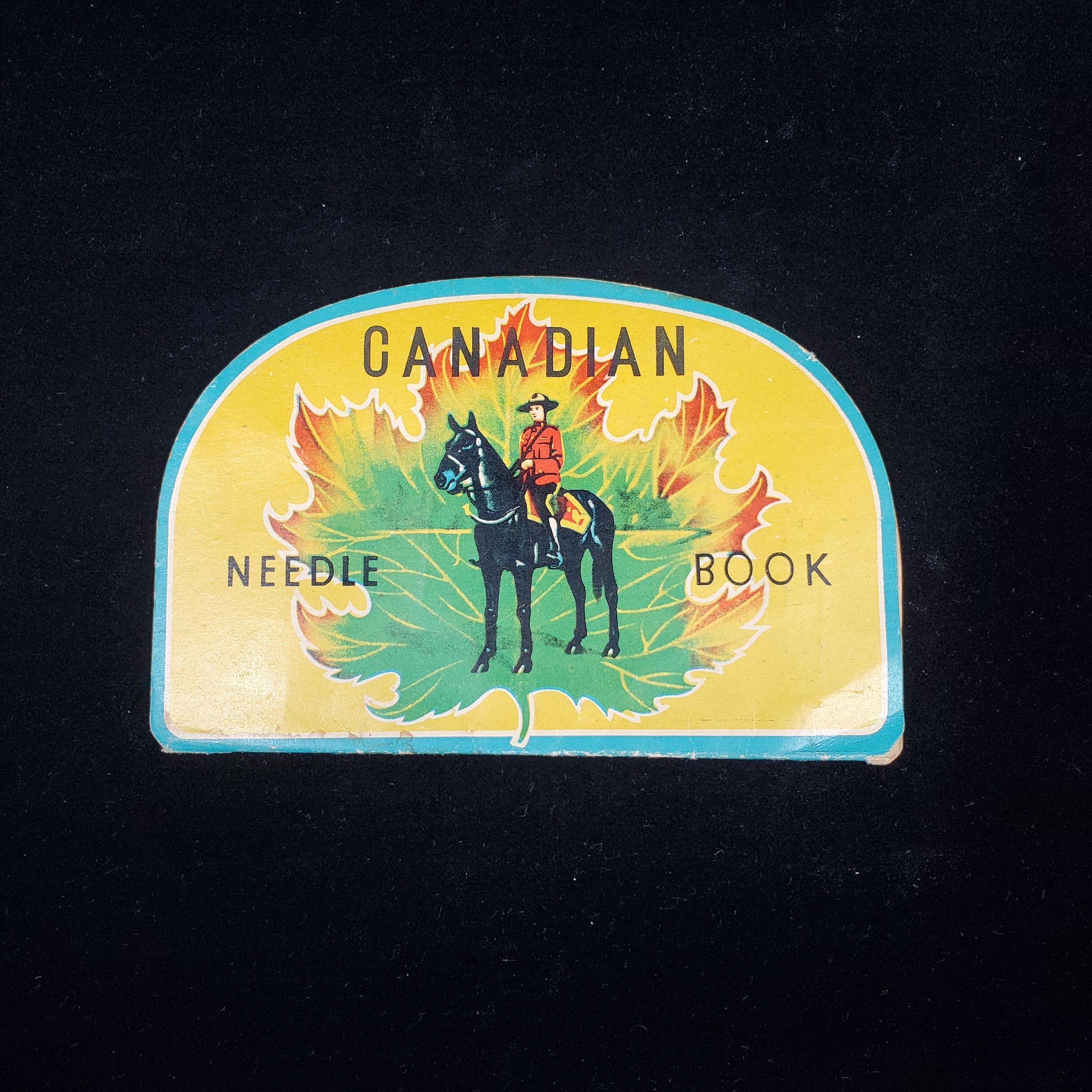 Cardboard Needle Case, half moon shape, with picture of RCMP on horse with green and red Maple Leaf at back - all on a yellow background. ÒCanadian Needle BookÓ in black print on outside. Back & front same. Inside on blue background coloured foils with different sized needles and 1 threader.
