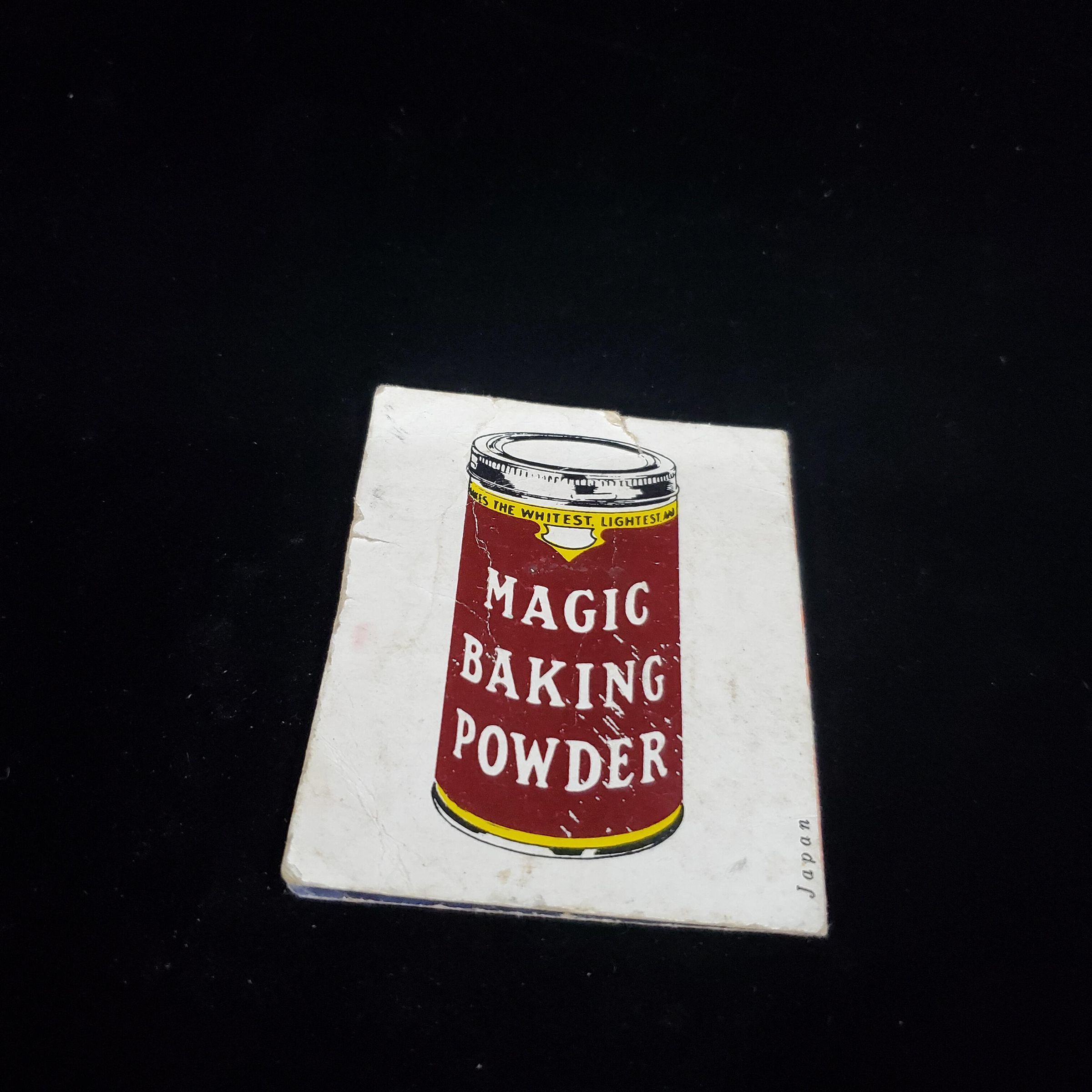 Advertising cardboard Needle Case. Small, pink,red, white and black geometric cover. On back advertising - a Magic Baking Powder can in colour. Inside 4 purple foil pieces cintaining needles on 3 and a threader on the 4th.