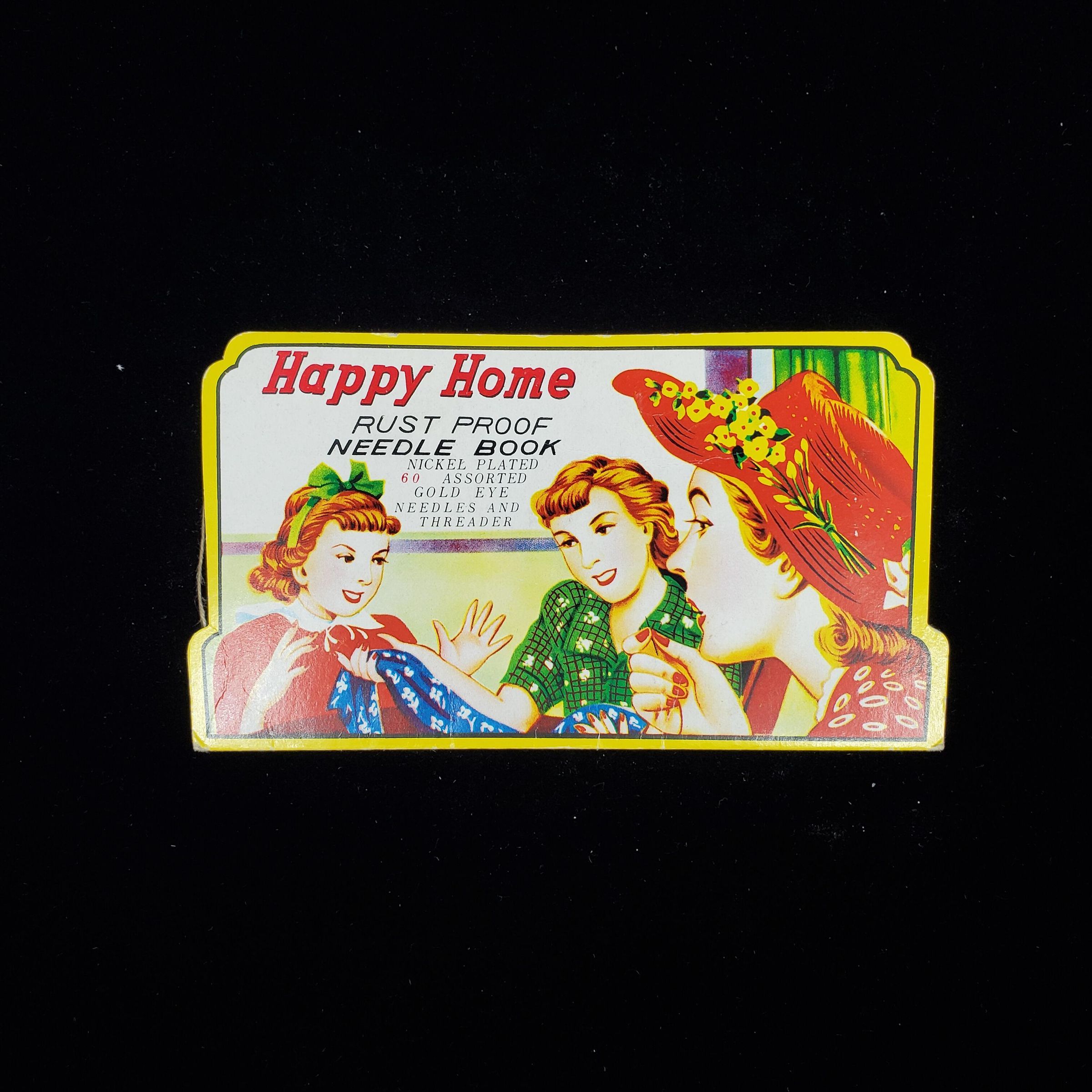 Lightweight cardboard needle case. Colourful picture of 2 older women and young girl sewing. ÒHappy Home Rust Proof Needle BookÕ 60 assorted nickel plated gold eye needles and threader. Inside foil backed needle places and needle threader.
