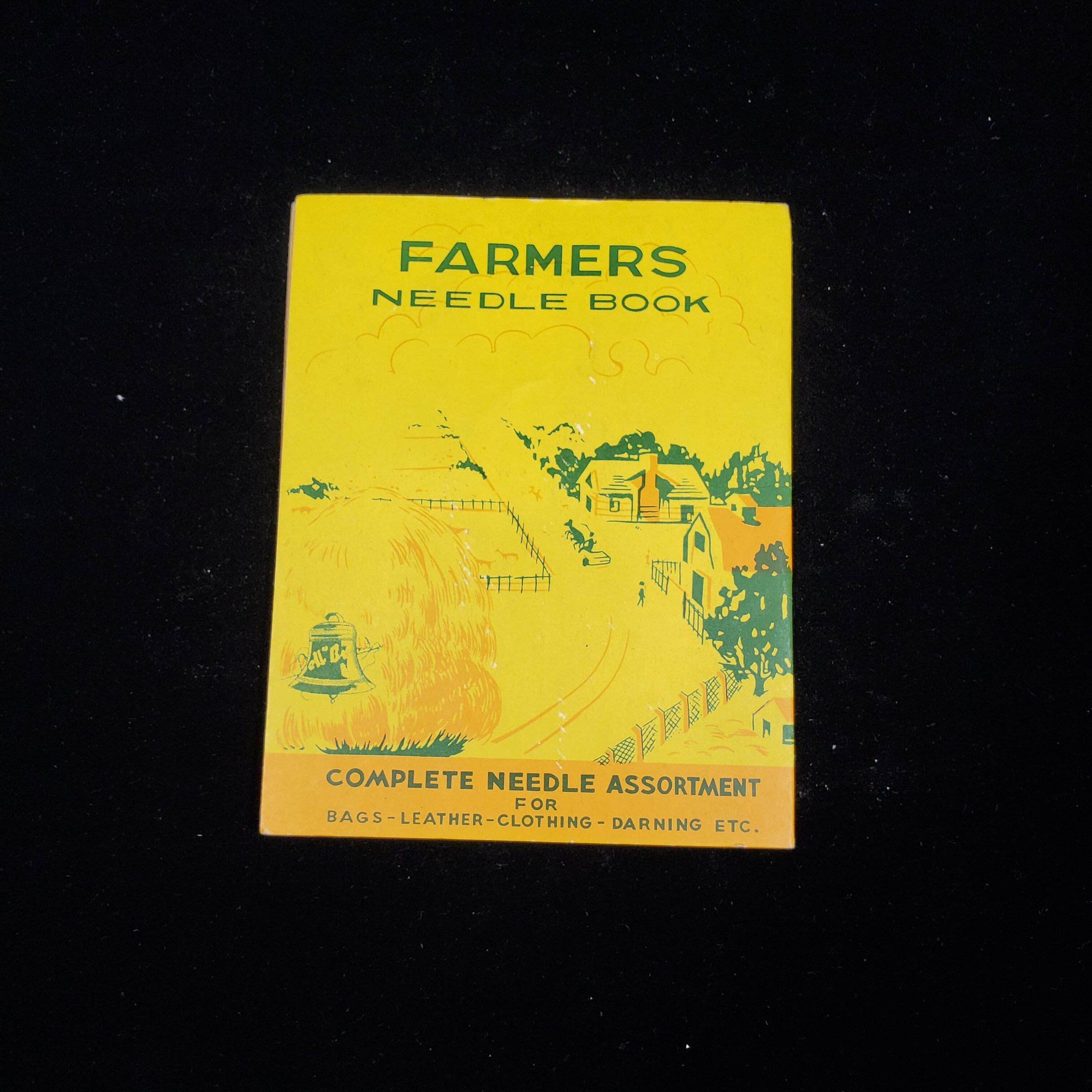 ÒFarmers Needle BookÓ Farm scene on yellow lightweight cardboard folder with ÒComplete Needle Assortmentr for Bags, Leather, Clothing, Darning, Etc.Ó in dark green colour. Back has more farm scene - same words. Inside assortment of needles in foil papers plus rug and heavy duty needles on other side.