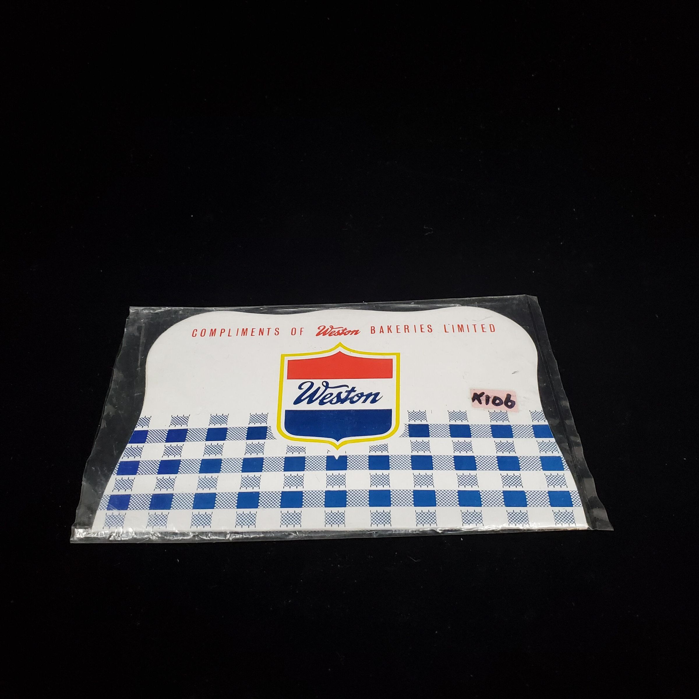 Lightweight carrdboard needle book. Advertising. Colours - red, white, blue and yellow. Cover reads ÒCompliments of Weston Bakeries Limited WestonÓ The name Weston in a red, white & Blue shield with yellow around outside.. Back advertising. Inside 2 foil backed areas of needles and i with a needle threader.