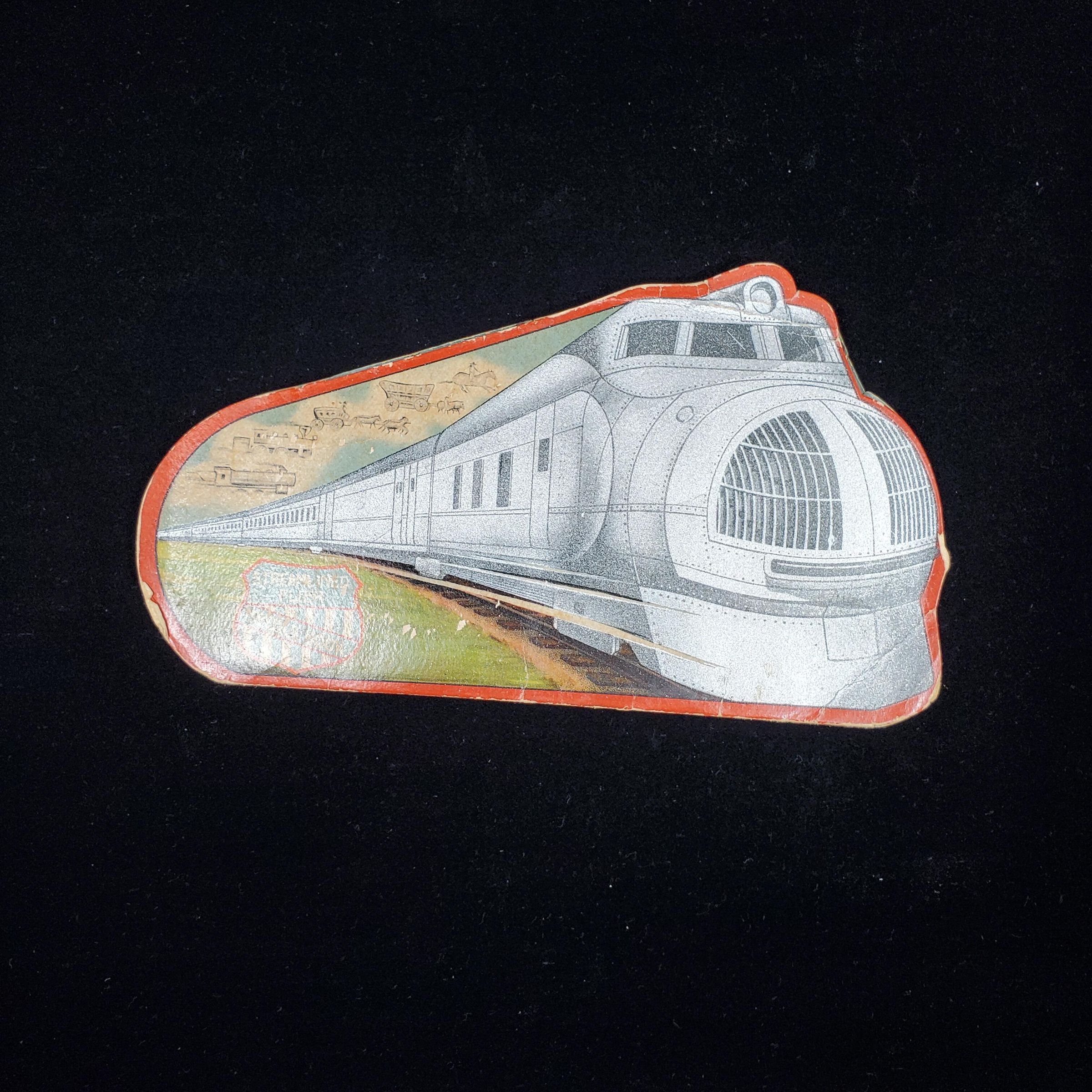 Light weight cardboard needle book ,mainly red, gray, green colours. In shape of train with background of horse covered-wagons, and steam trains. Crest reads 'Streamlined Flier Needle Book' Inside 7 places for needles - incomplete. Stamped Japan.