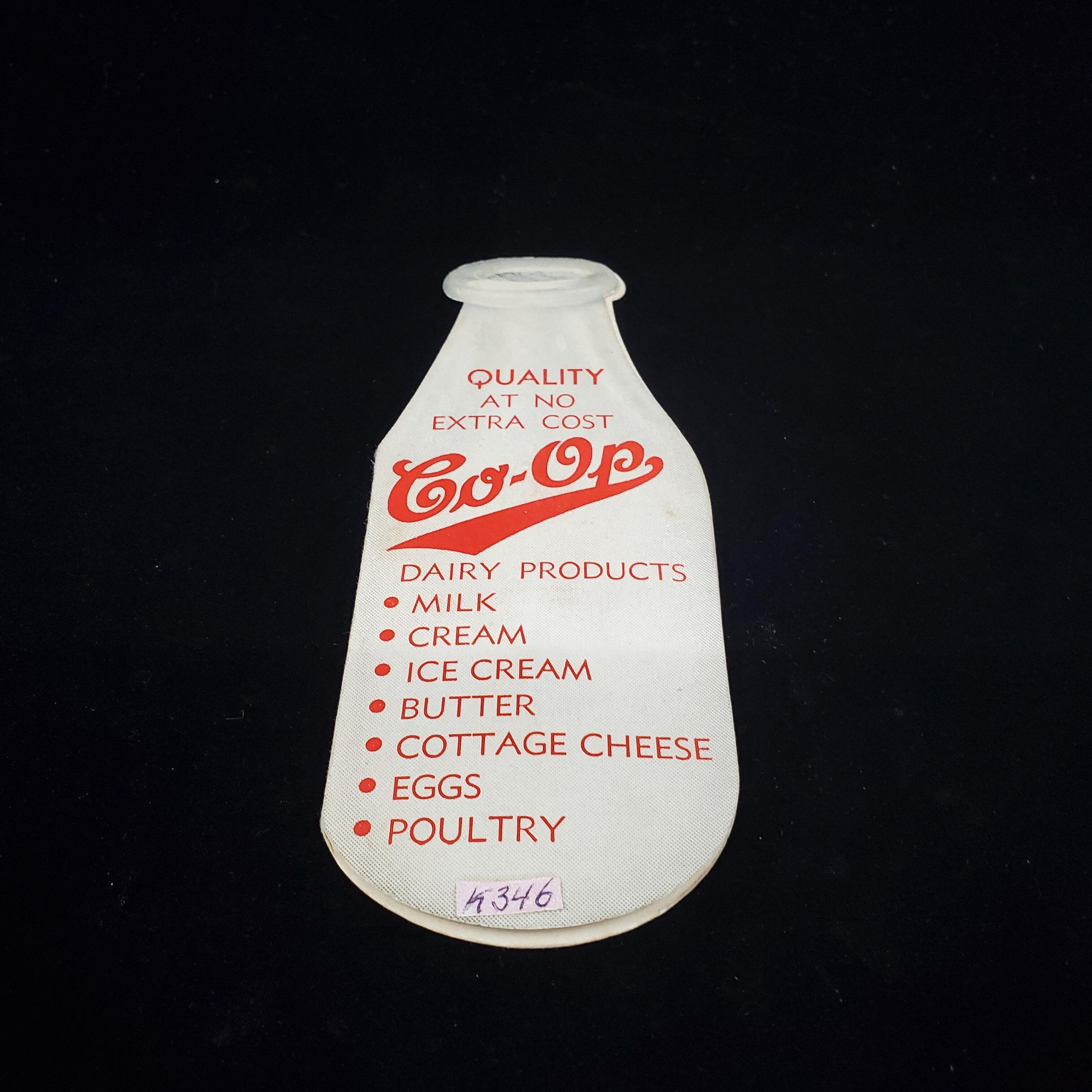 Lightweight cardboard need le book in shape of milk bottle. Advertising. Colours white and red. Front reads Ò ÒCo-opÓ plus a list of products in red print. Back ÒDrink Vi-co Chocolate DrinkÓ. Inside 2 foil backed areas with needles.