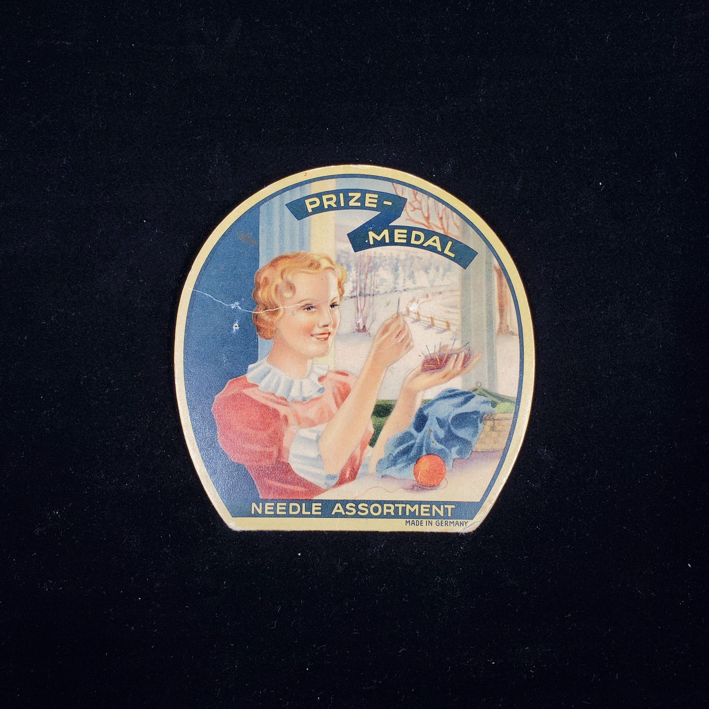 Lightweight cardboard needle book in shape of Horse Shoe. One side shows woman on horse and woman in car with Ò Prize Medal Needle Assortment Made iin GermanyÓ Other side shows woman putting needles into pin cushion. Inside 5 packets of Princess Needles and1foil area.