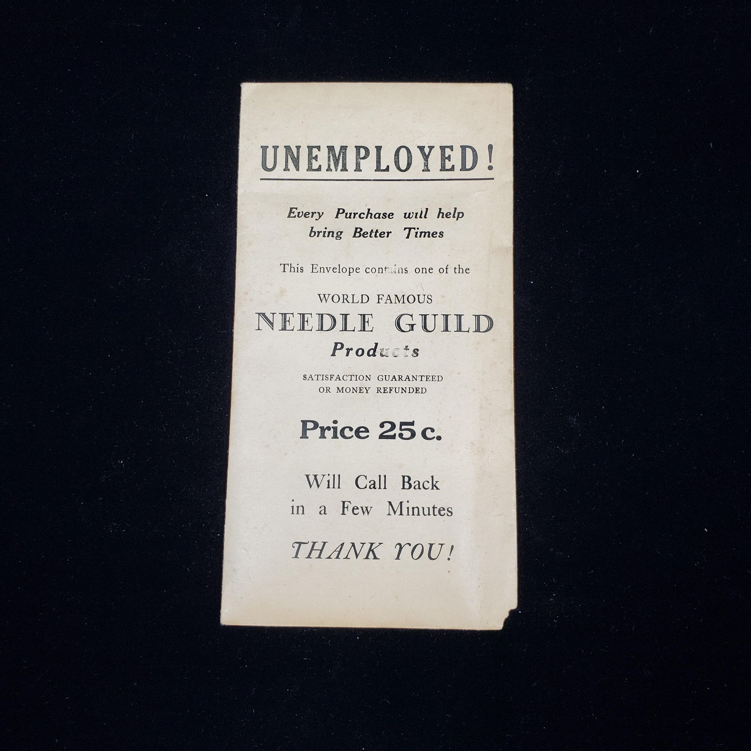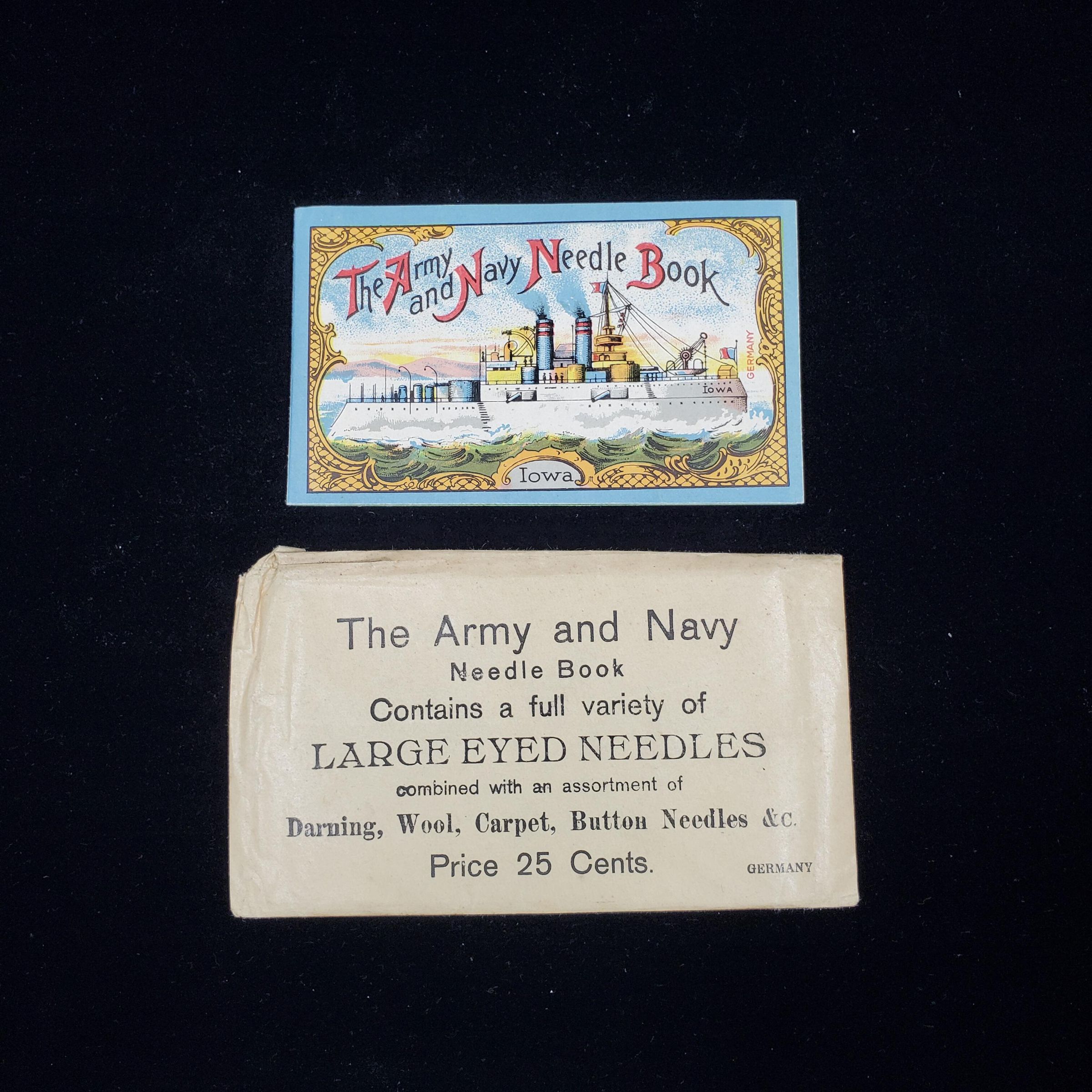 Cardboard needle book in original brown paper envelope. ÒThe Army & Navy Needle Book Ò with battleship Iowa on cover. This has then been put into a larger brown envelope titled ÒUnemployed!Ó