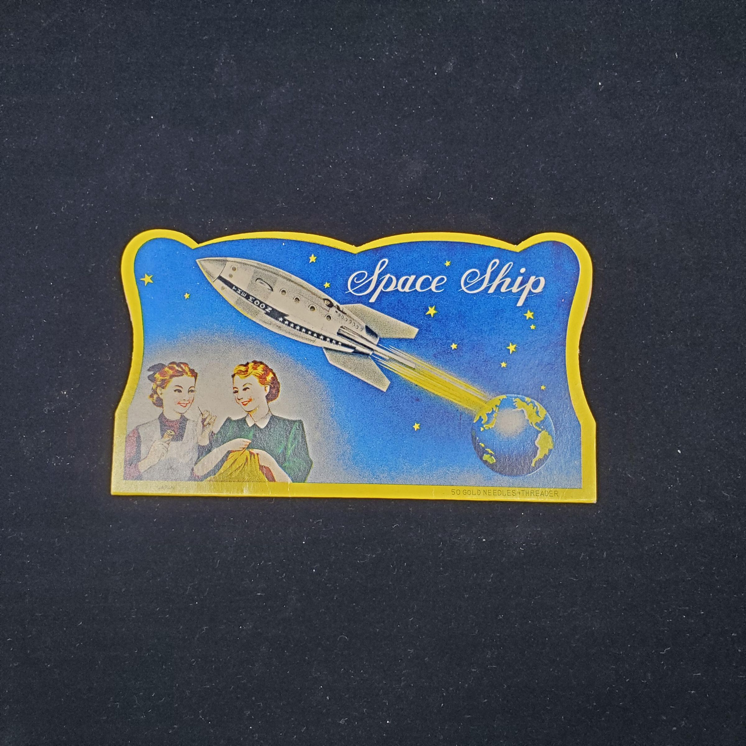Light weight cardboard nedle case. Colours blue and yellow. 'Space Ship' with picture of ship and 2 women sewing. Back same. Inside 6 foil backed areas of needles amd1 of needle threader with 'Rust Proof Hand Sewing Needles' Scalloped top edge.