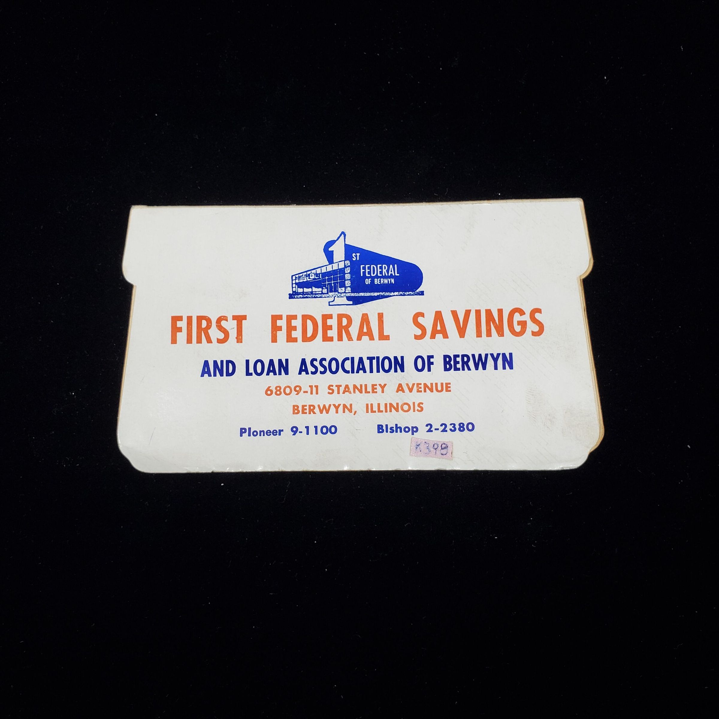 Lightweight cardboard needle book, Advertising. Colours - white, red, blue. Front reads 'First National Saving and Loan Association of Berwyn' with address, phone and picture of building. Back reads 'A Stitch in Time saves nine' plus more advertising and spool with needle & thread. Inside 6 foil backed areas for needles plus one for threader.