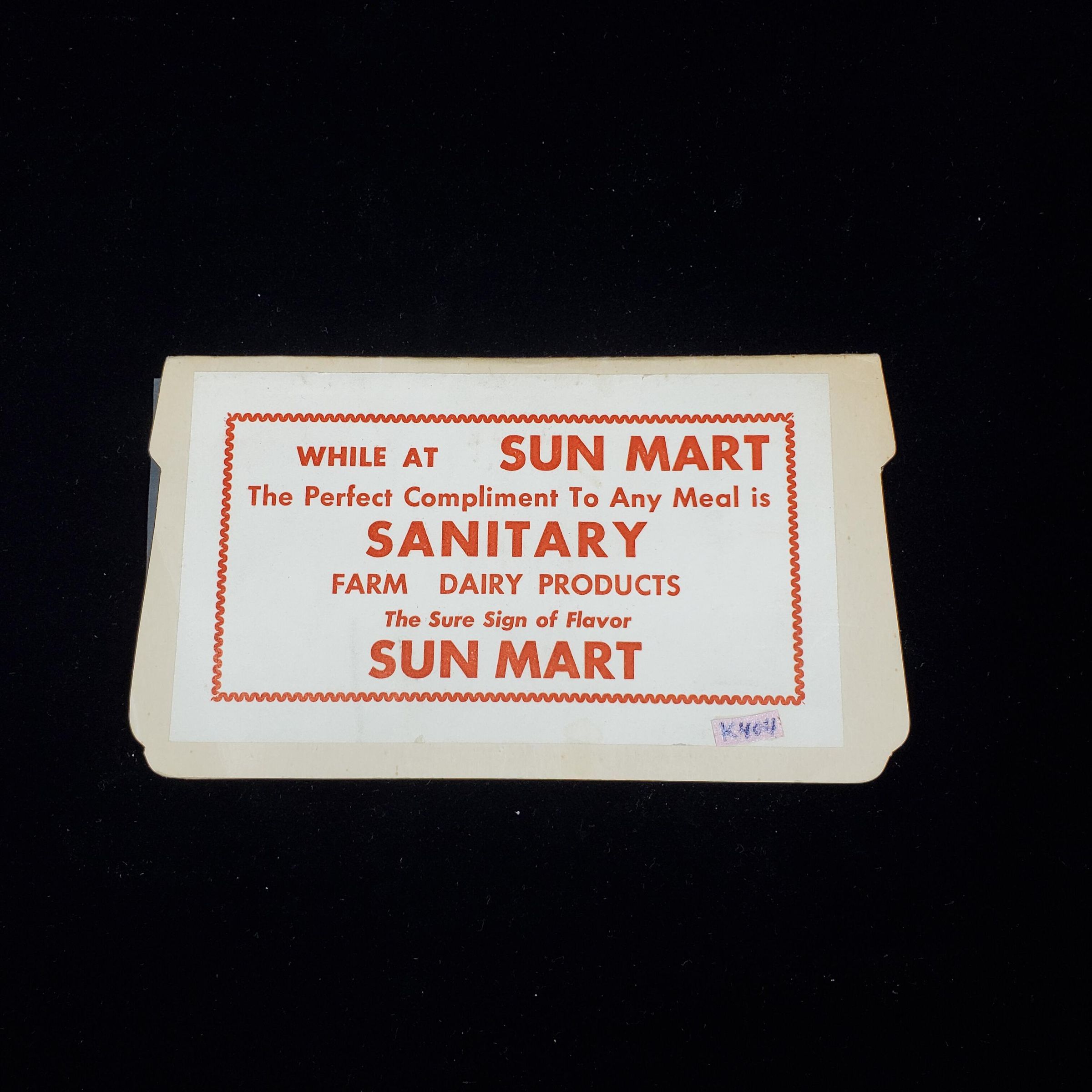 Lightweight cardboard Advertising needle book. Front readsÓ Compliments of Sun Mart Lower Price Plus Free Big Dollar Stamps,& Convenient Location To Serve YouÓ Back has more advertising.Inside 6 foi backed areas for needles and 1 for threader.