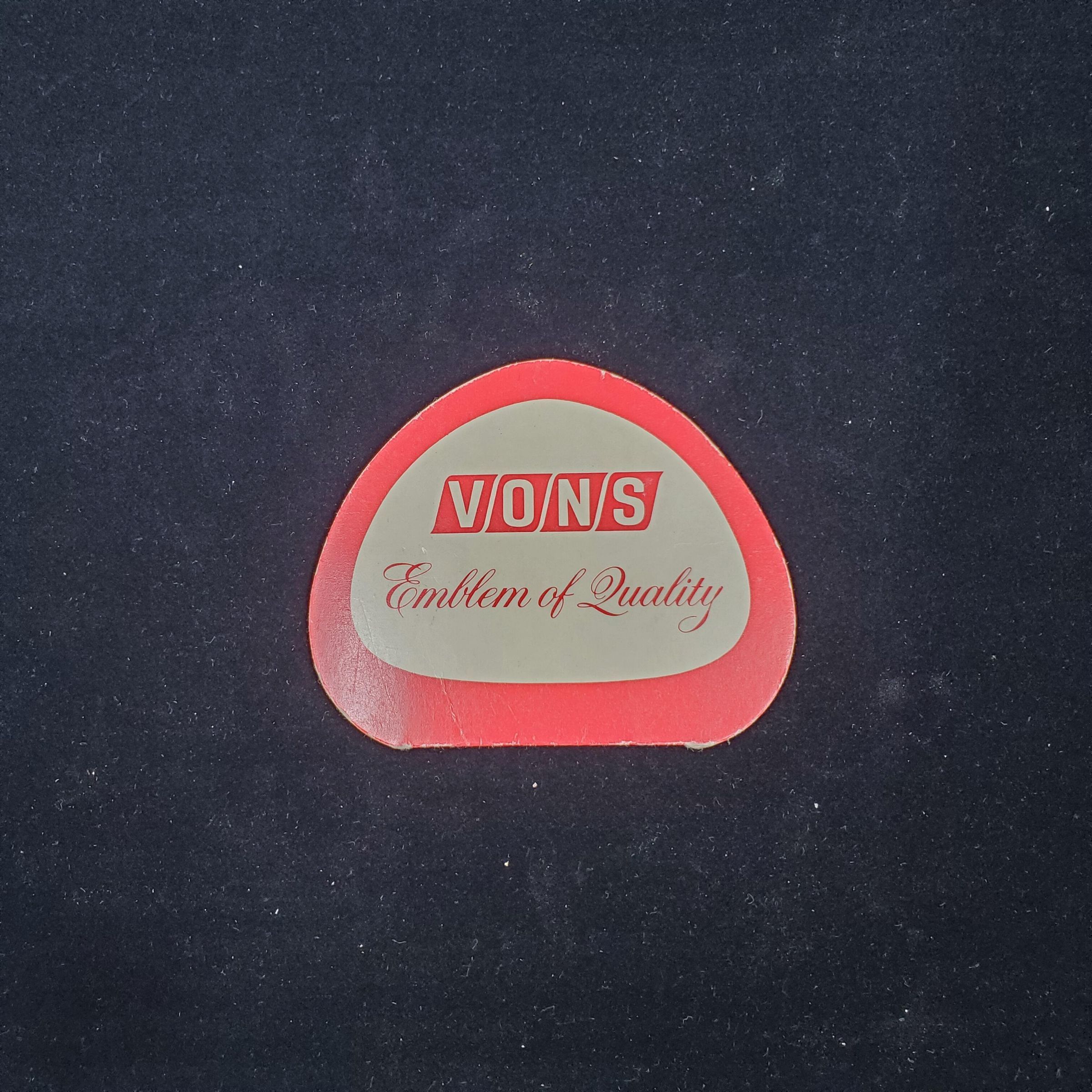 Lightweight cardboard needle book, small , 1/2 circle shape. Colours - red, white. Advertising. On front 'Vons Emblem of Quality'. Back more advertising. Inside 2 foil backed areas for needles. West Germany.