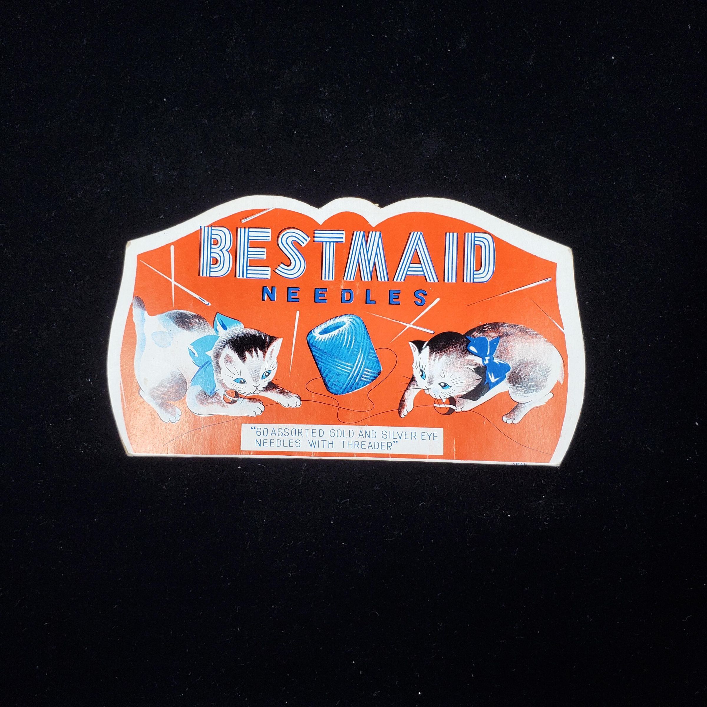 Lightweight cardboard needle book. Colours - red. blue, black, white. Front cover reads ÒBest Maid Needles - 60 assorted gold and silver eye needles with threaderÓ Back same excpt store price label reads 5c. Inside 6 foil backed areas for needles plus one empty. No threader. 1966 is stamped inside.