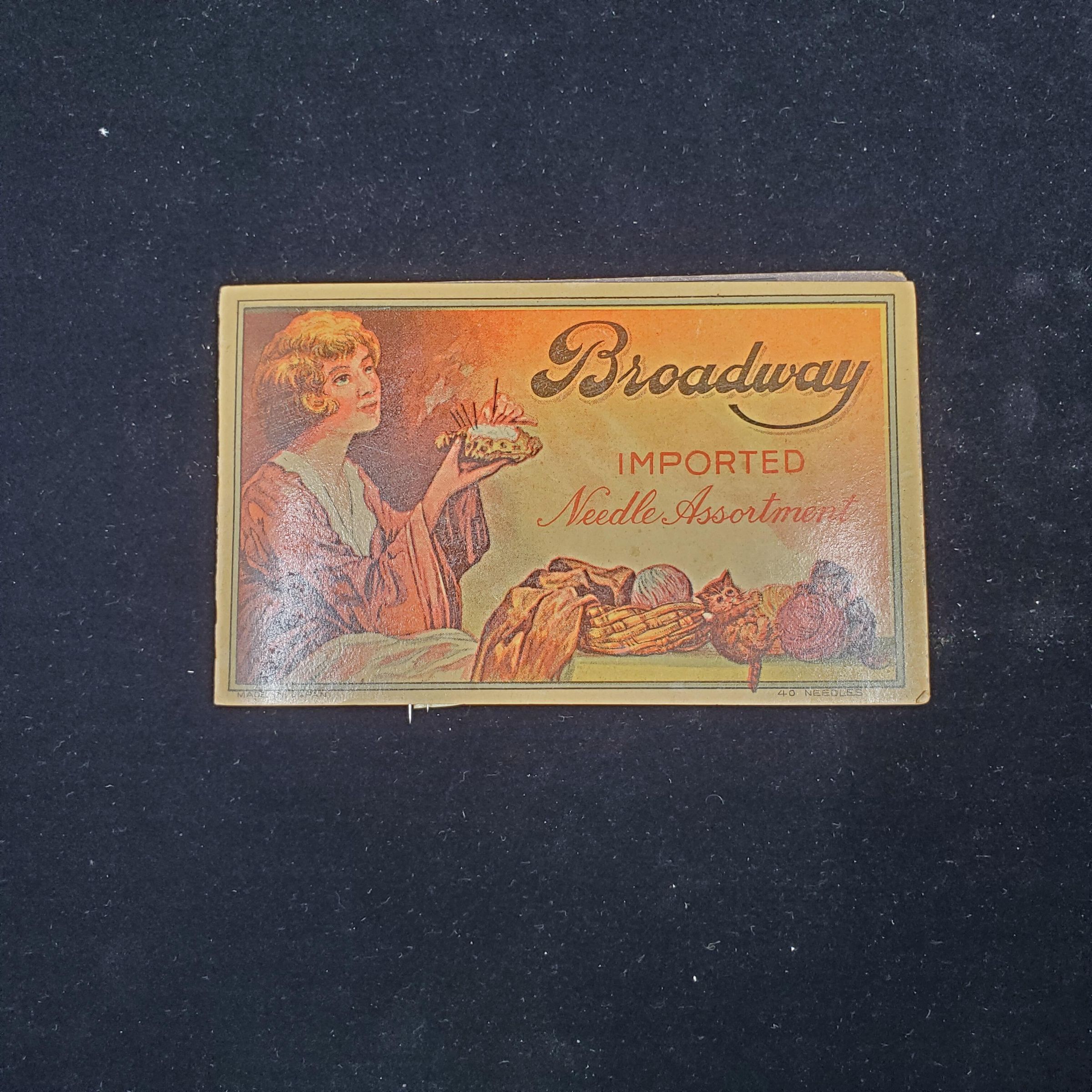 Lightweight cardboard needle book. Colours - red, yellow, black ,brown. Front cover reads 'Broadway Imported Needle Assortment Made in Japan 40 needles 'Picture of woman holding pin cushion with 2 cats & ball of yarn. Back cover same. Inside black & gold paper covered needles. Needle book is still in original plastic envelope.