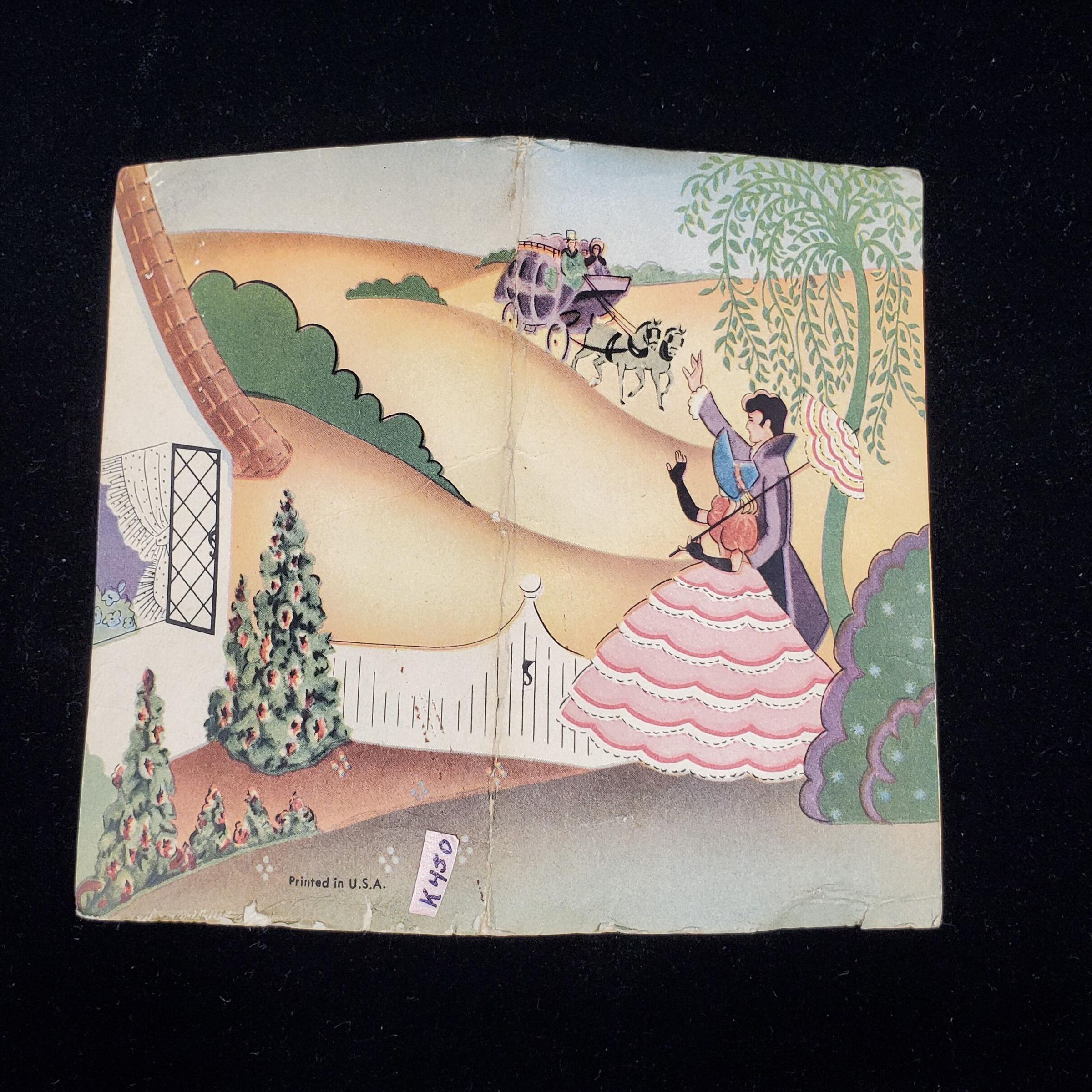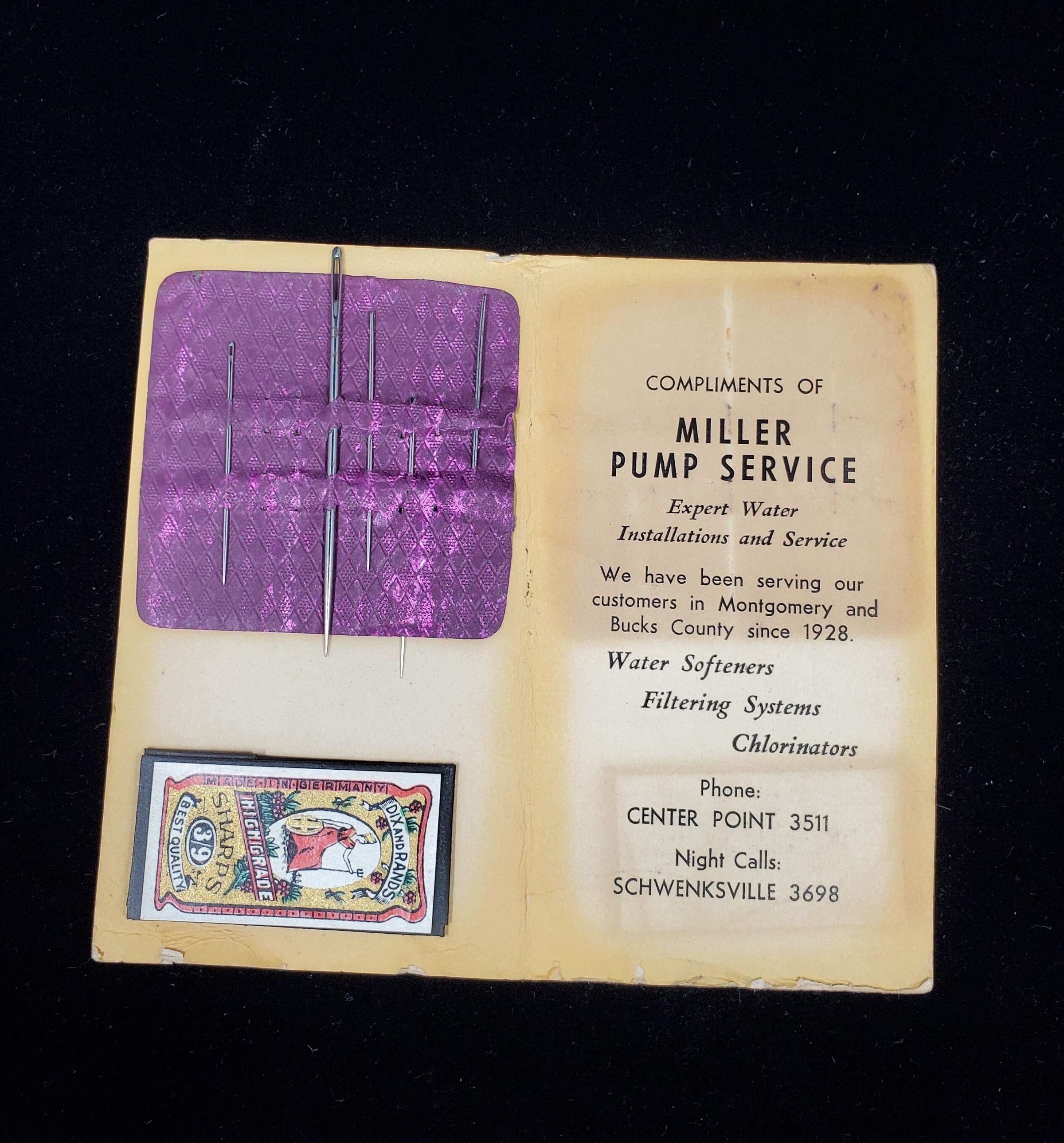 Lightweight cardboard Advertising needle book. Colours - pink, yellow, green. OLd fashioned dressed lady with parasol and gentleman, horses and carriage with trees . Inside one foil backed area of needles and 1 packet Dix & Rands needles.. Compliments of Miller Pump Service with ad for services, plus phone numbers.
