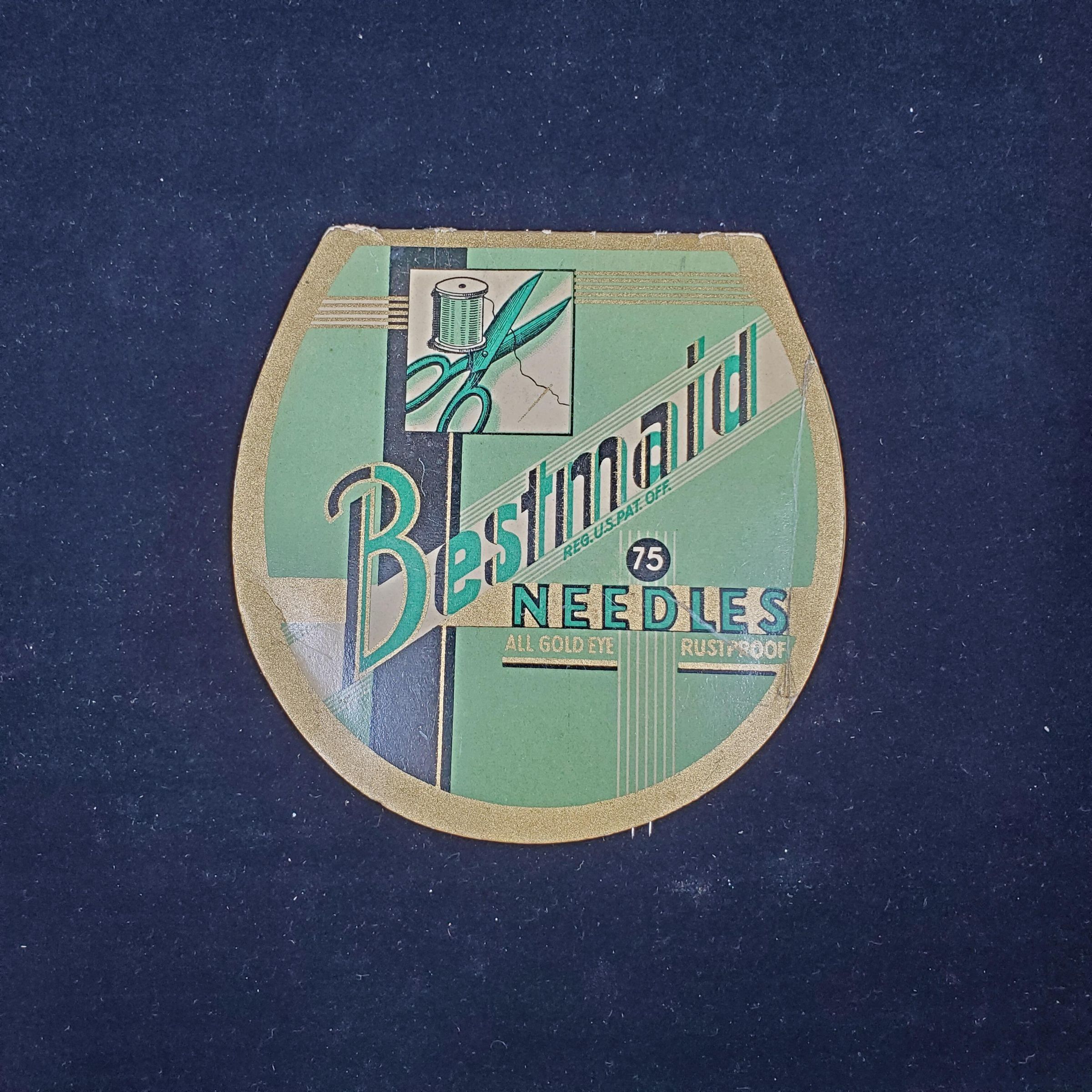 Lightweight cardboard Needle Book. Colours - green, white, black. Front & back covers same ., with 'Bestmaid 75 Needles Reg. U.S. Par. Off . printed across front. Also picture of scissors, spool of thread and line designs. Inside6 areas for needles. 5 are packets of BestMaid Needles, 6th - open needles on black paper. Made in Germany printed on cover.