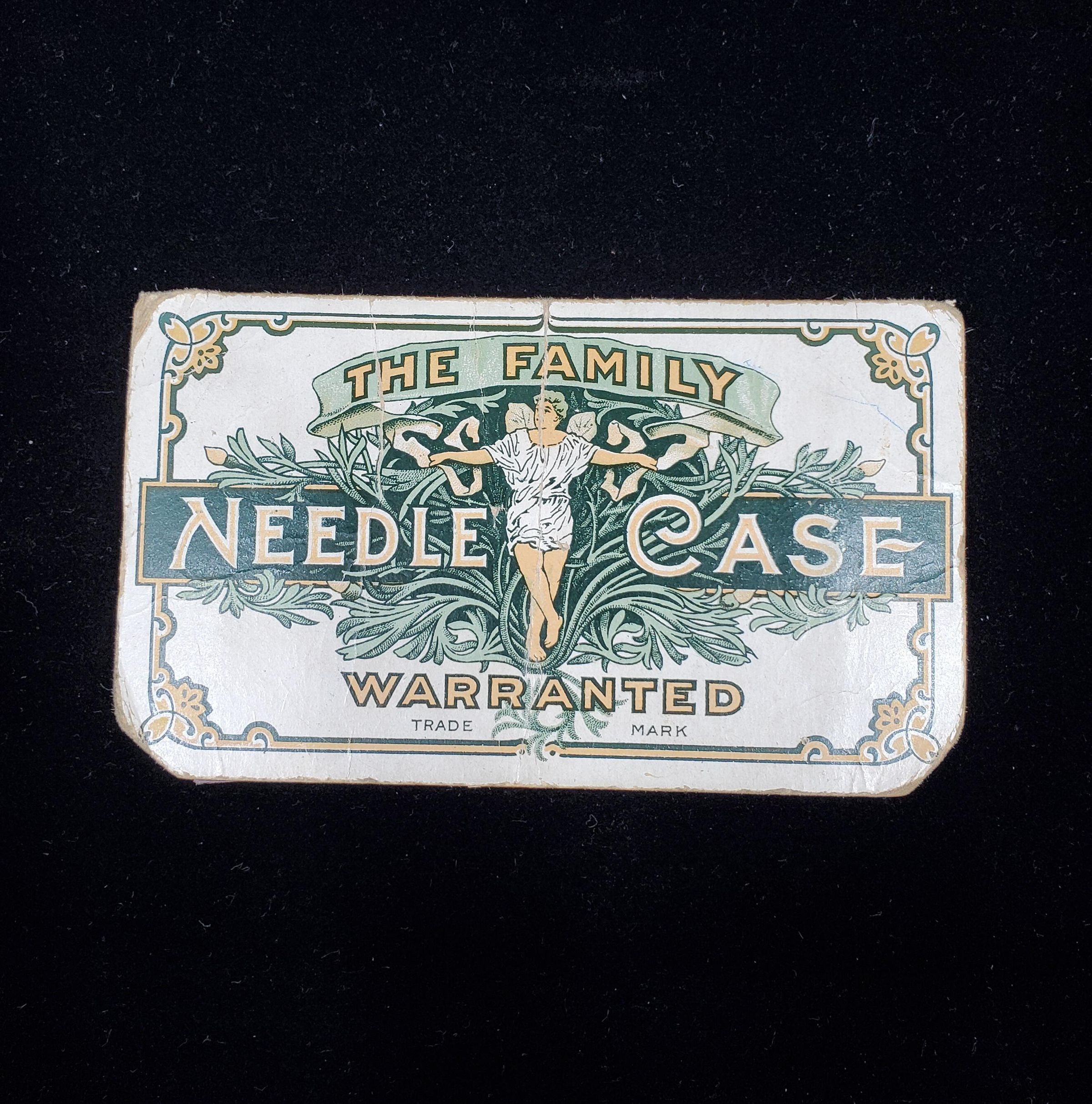 Cardboard needle book. Colours white, green, yellow. Cover reads ÒThe Family Needle Case Warranted Trade MarkÓ . Has picture of man surrounded by green leaves. Back same. Inside 4 packets of needles with Eagle on outside, 1 paper that looks like it would hold a threader and one open area for needles.