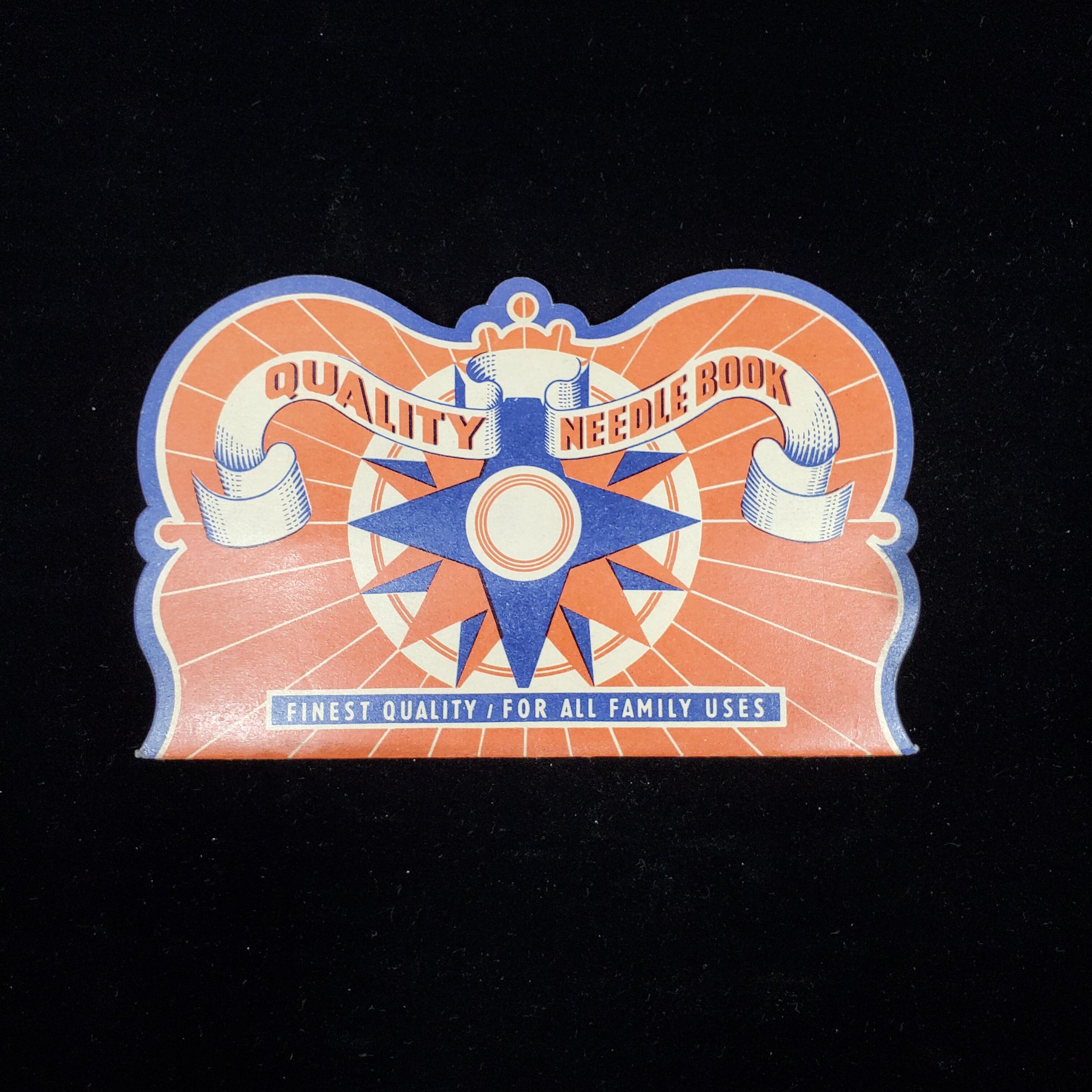 Large light weight cardboard needle book. Colours - red white and blue. Back & front cover same. Overlapping star with banner above reading ÒQuality Needle Book Finest Quality / For all Family UsesÓ Inside 5 foil backed areas with needles (one missing) and 1 with needle threader Directions for doing Running Stitch.