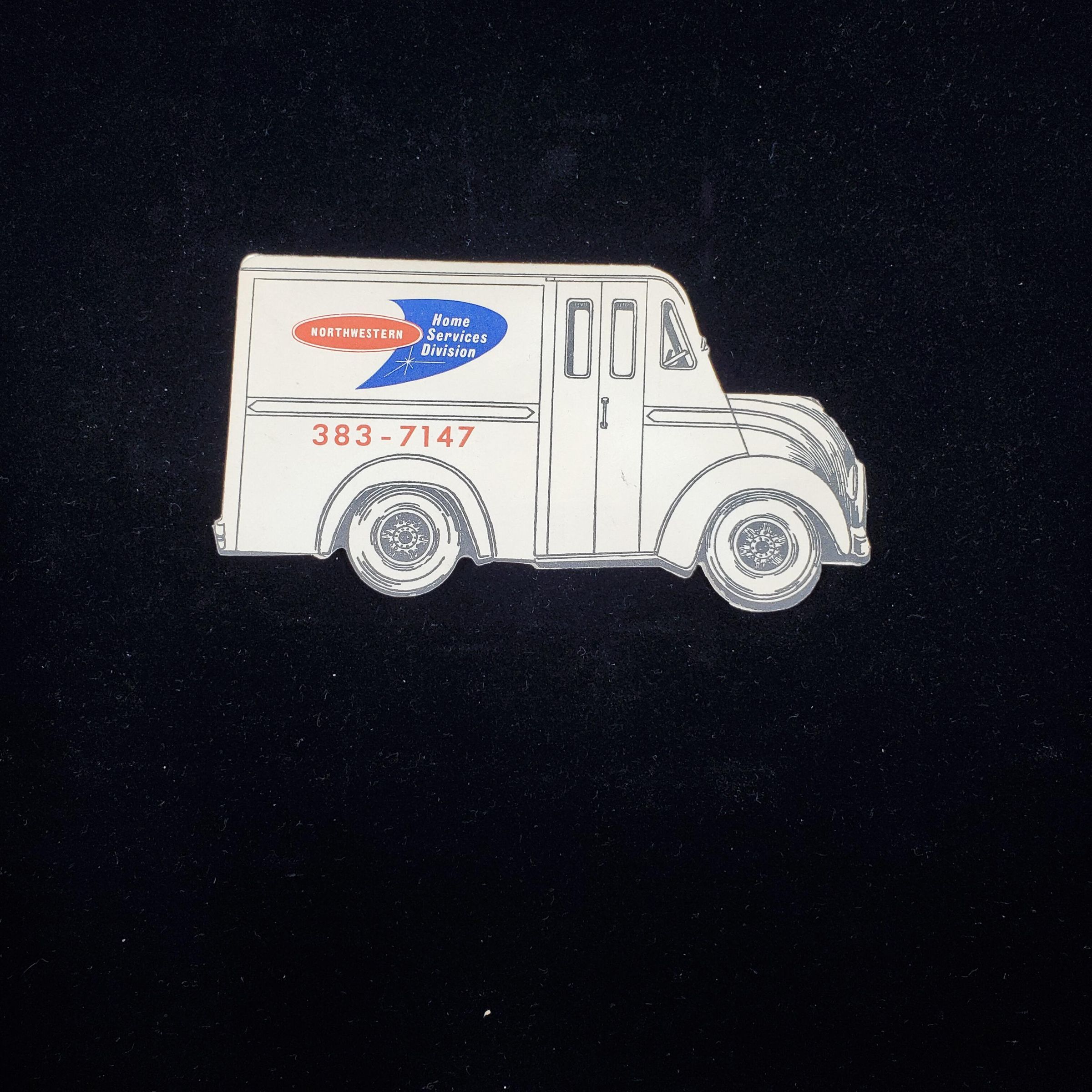 Lightweight cardboard needle book in shape of truck. Advertising. White with red, blue. and black. Truck reads ÒNorthwestern Home Services Division 383 7147Ó. Back has advertising of products. Inside 1 foil backed area of needles, and 1 package with a needle threader.