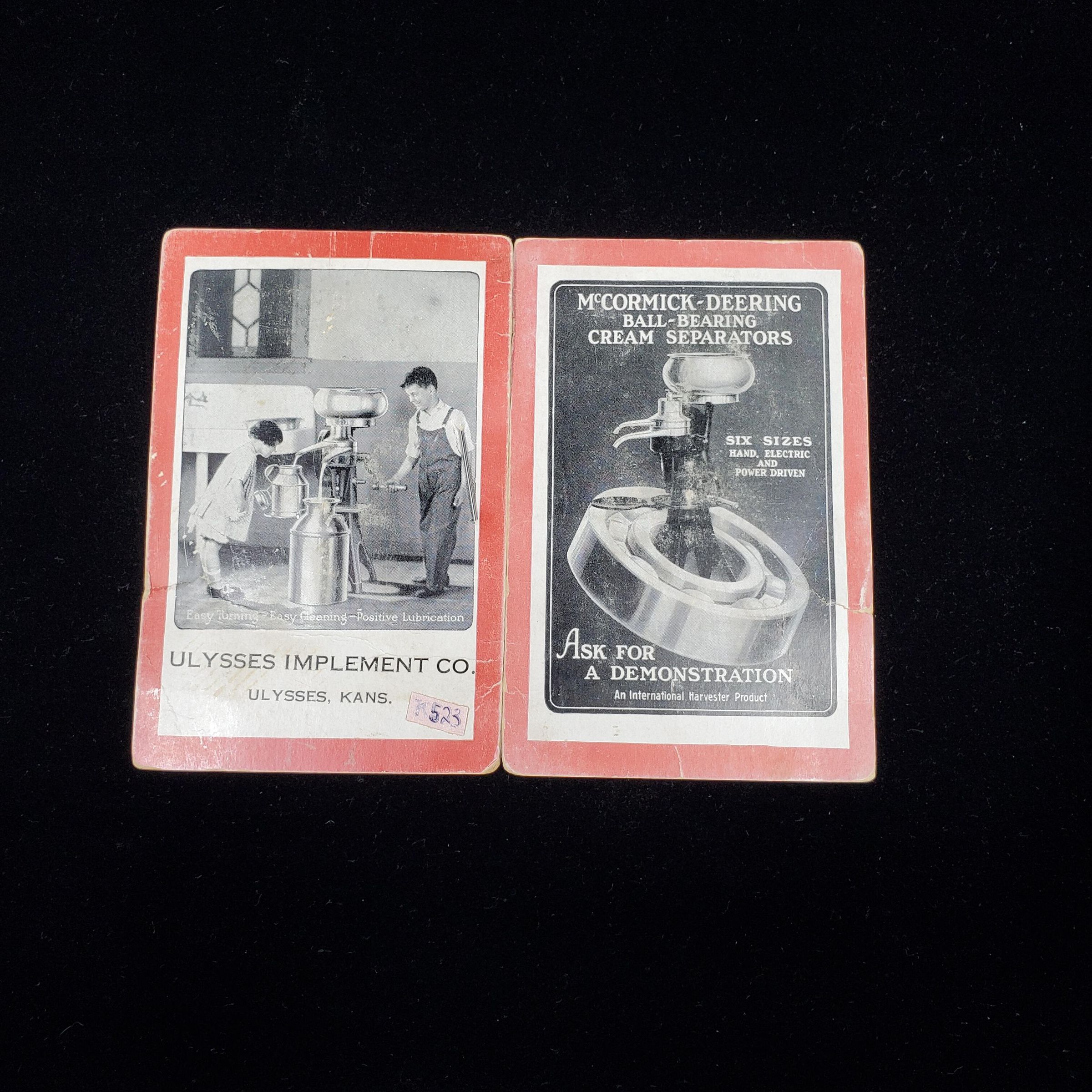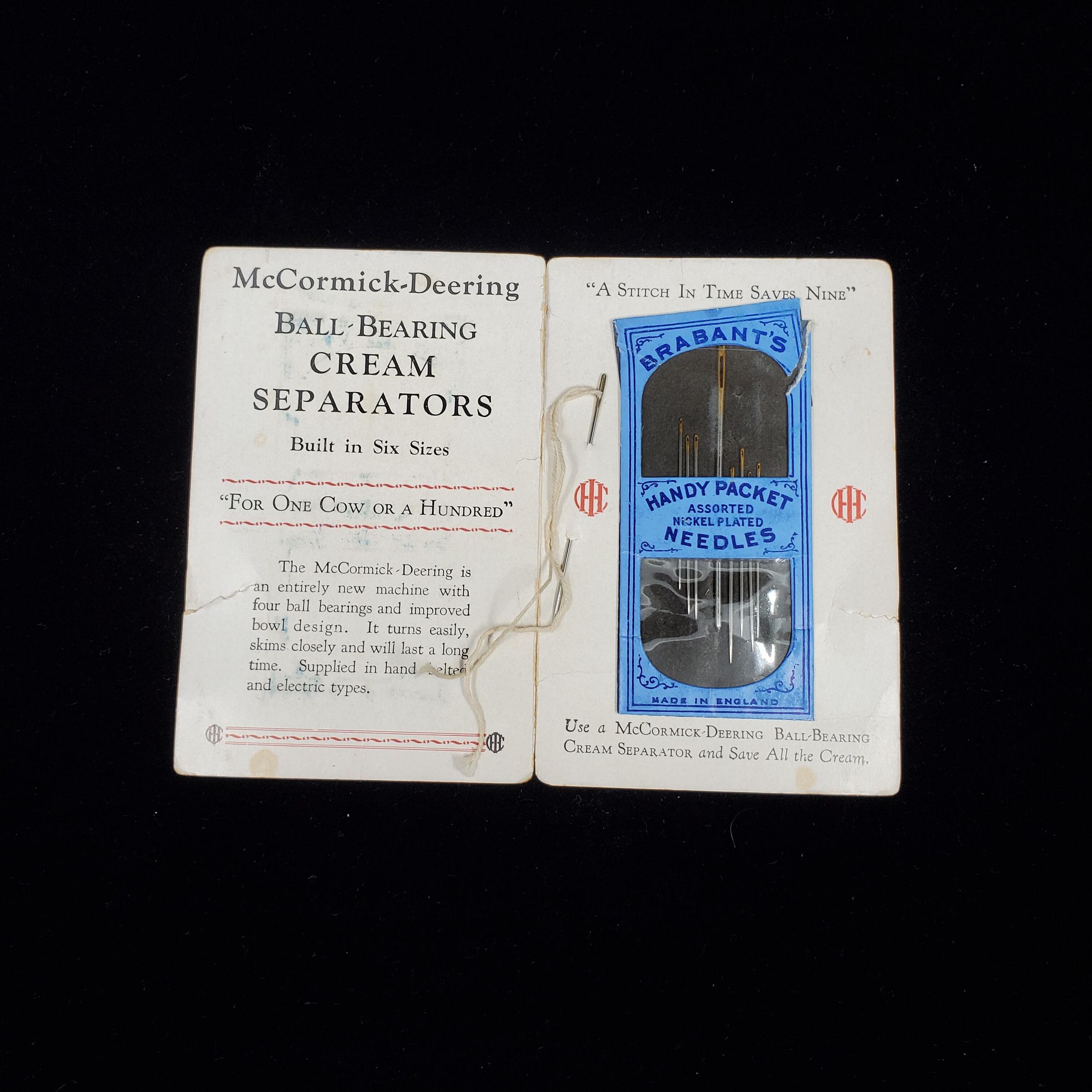 Advertising cardboard needle book. Colours - red, white and black.Picture of cream separator of front with ÒMcCormick-Deering Ball-Bearing Cream Separators Six Sizes Hand,Electric and Power Driven Ask For Demonstration An International Harvester Product. Back -picture of use with ÒUlysses Implement Co. Ulysses, Kans. Inside Pck of Needles & advertising.