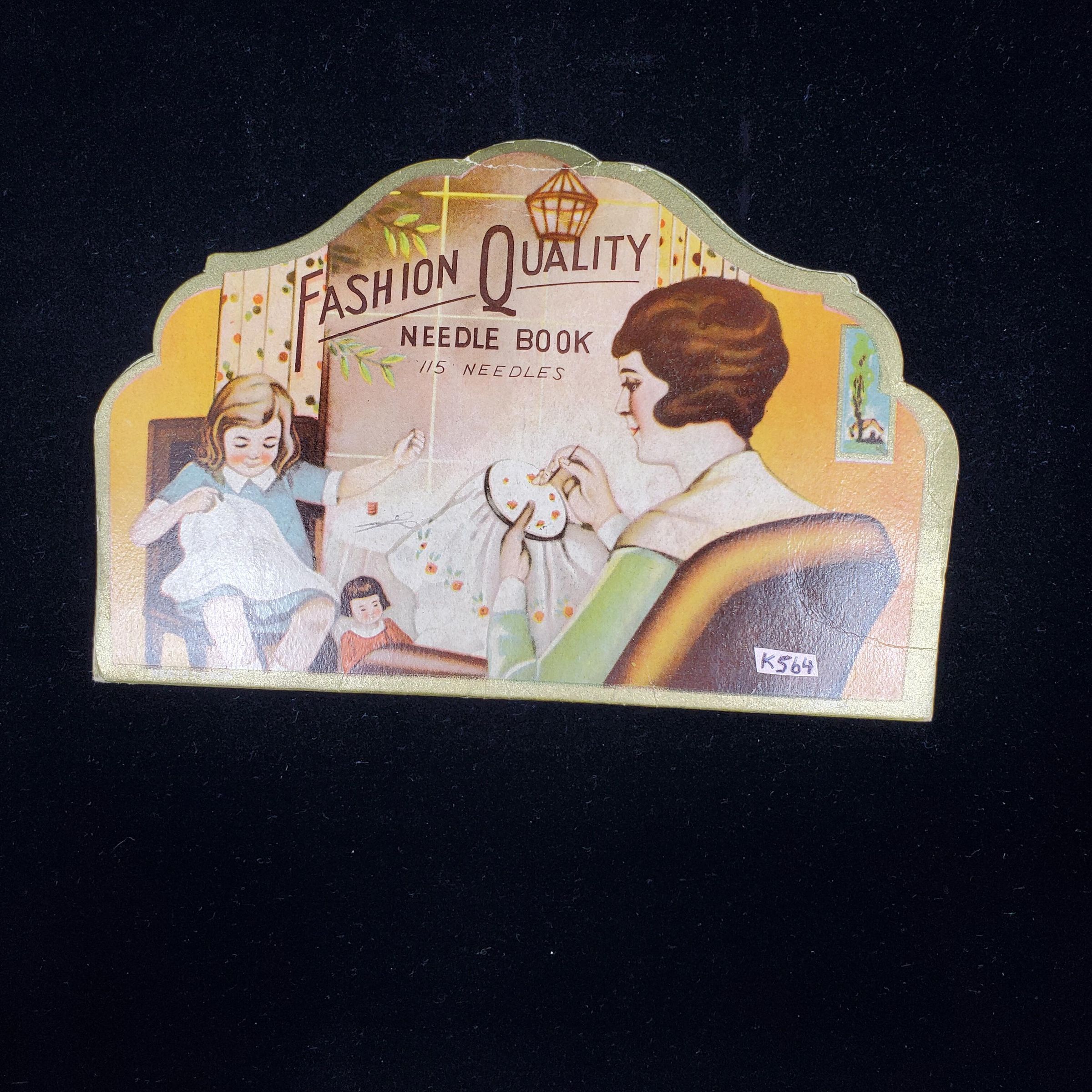 Lightweight cardboard needle book. Colours - gold, brown, cream, red. Picture on cover one side of Woman and child with doll, both doing needlework. Other side Basket of threads, skeins, scissors, etc,Covers read ÒFashion Quality Needle Book 115 NeedlesÓ Inside 6 foil backed areas with needles, one with needle threader.