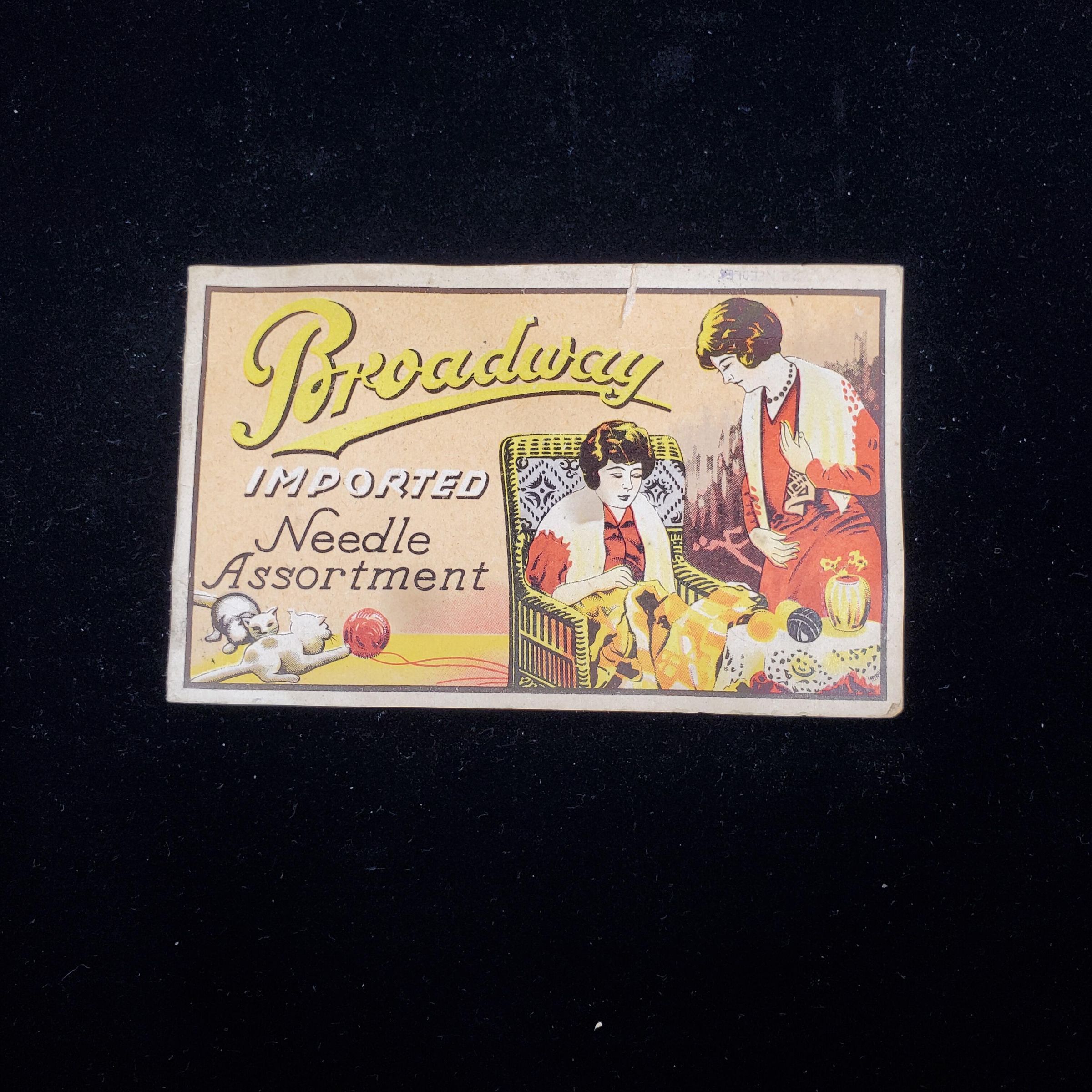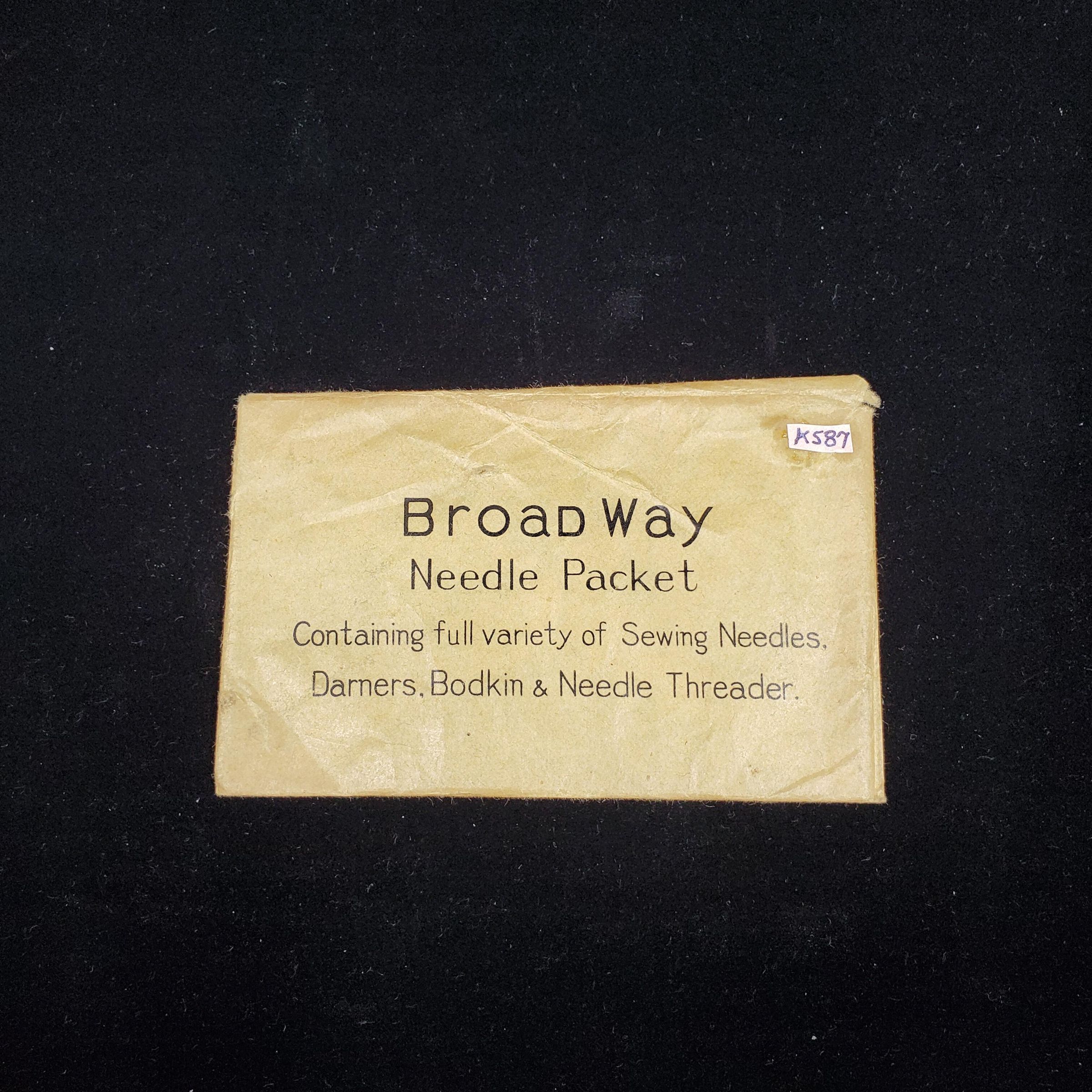 Lightweight cardboard needle book in original envelope. Envelope reads ÒBroadwayNeedle Packet Containing a Full Variety of Sewing Needles, Darners, Bodkin,& Needle Threader. Needle Book inside titledÓBroadwayÓ has 2 women sewing on cover. Inside3 packets Superior needles, 1 open set of needles on black paper and needle threader.