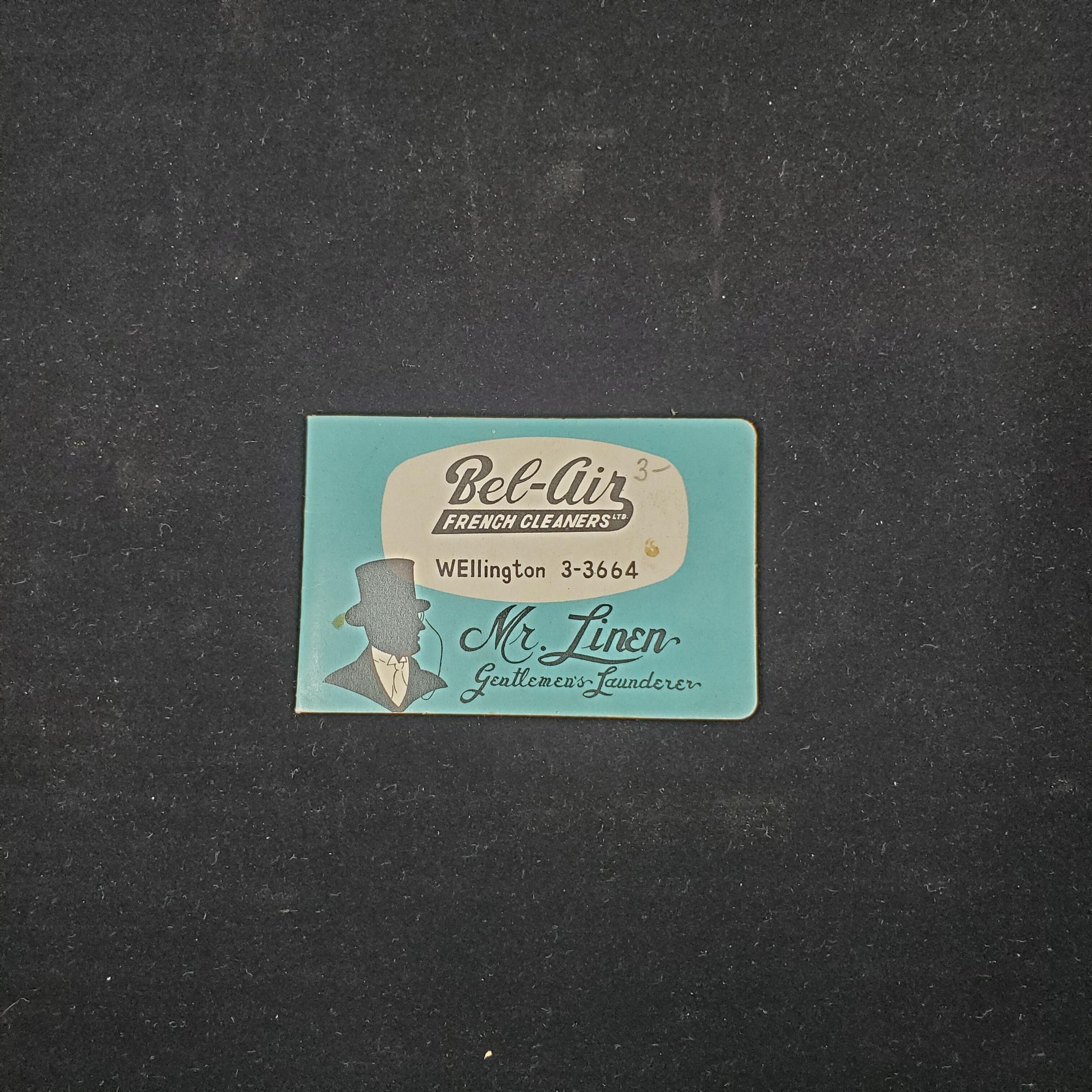 Advertising needle book, small give-away type. Colours - green, white and black. Cover shows head of man in top hat with words ÒBel-Air French Cleaners WEllington 3 -3664 Mr. Linen GentlemanÕs LaundererÓ Back reads ÒQueenÕs Jubilee LaundryInc. WElington 7 -7471Ó. Inside Foil backed areas for needles one side, needle threader other side.