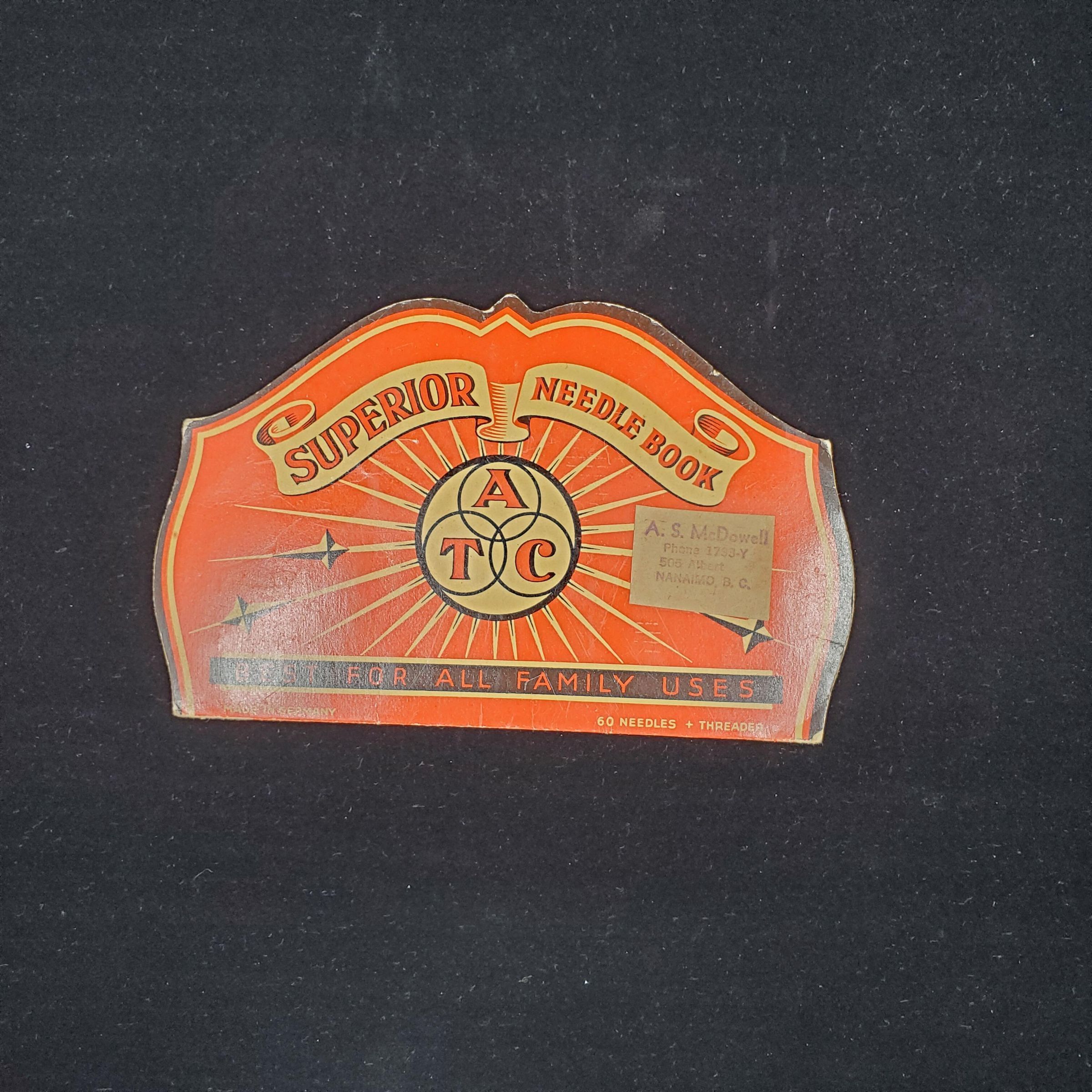 Lightweight cardboard needle book. Red-orange with white and black. Cover reads ÒSuperior -Needle Book Best For All Family Uses 60 needles + threader Made in England ATCÓ Inside - 6 foil backed areas for needles, 1 for threader. No threader.Seal of seller on book ÒA.S.McDowell Phone 1733-Y 505 Albert Nanaimo. B.C.Ó
