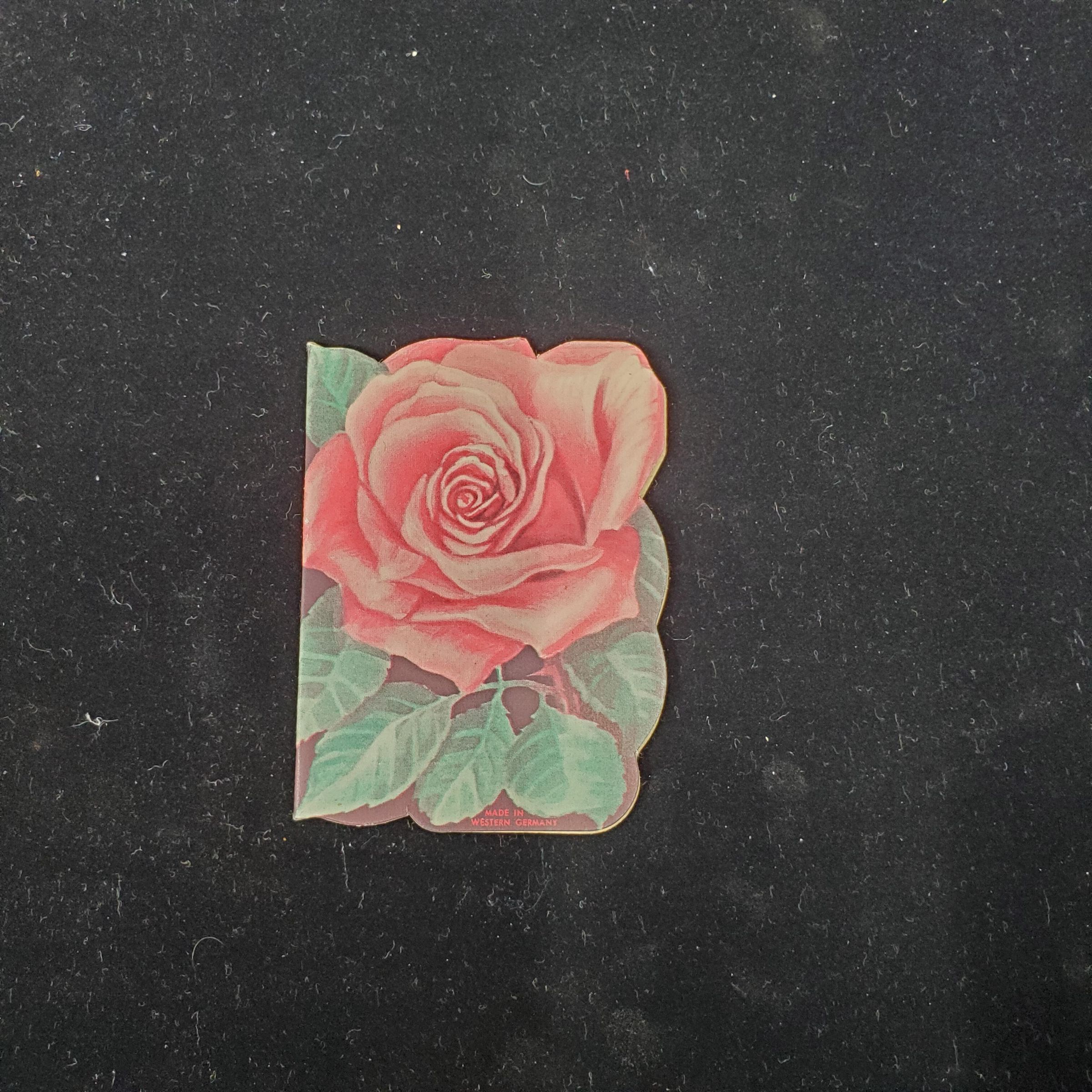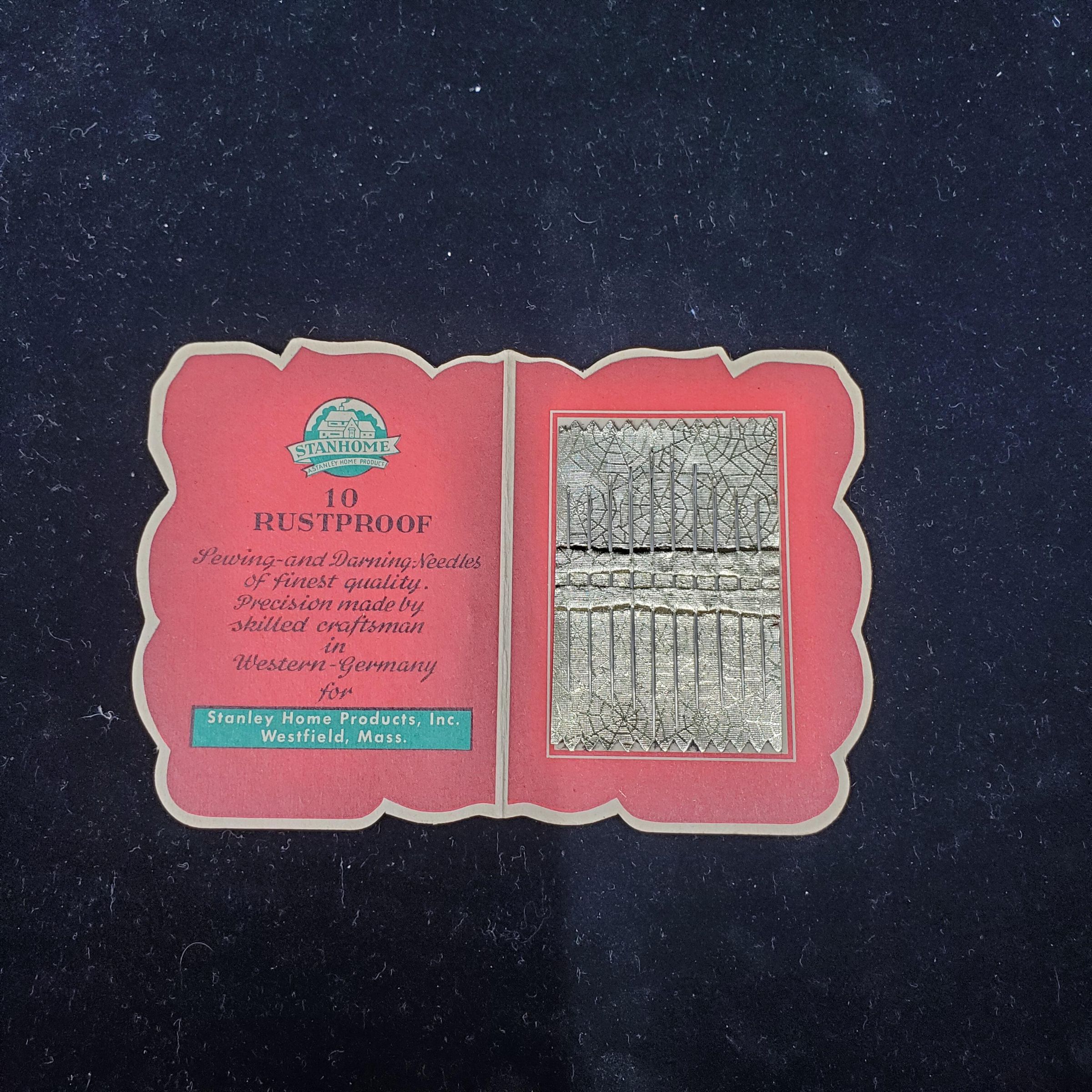 Cardboard needle packet in shape of Rose with leaves.. Advertising. Inside one side has foil backed needles, other side advertising. Advertising by ÒStanley Home Products inc. Westfiekld, MassÓ