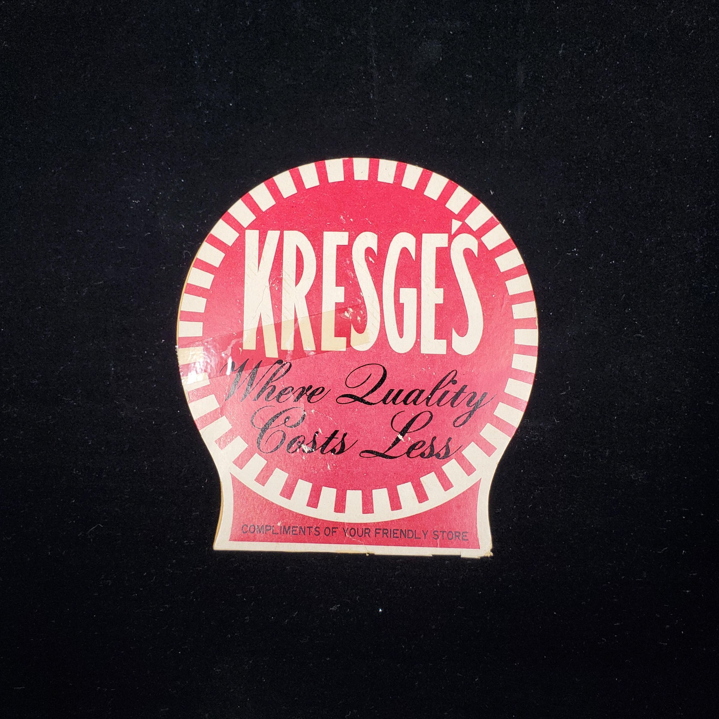 Large round cardboard Advertising needle book. Colours - red, white and black.Front cover reads ÒKresgeÕs Where Quality Costs Less Compliments of your Friendly StoresÓ.Front and back same. Inside 6 foil backed areas with needles, 1 with needle threader.