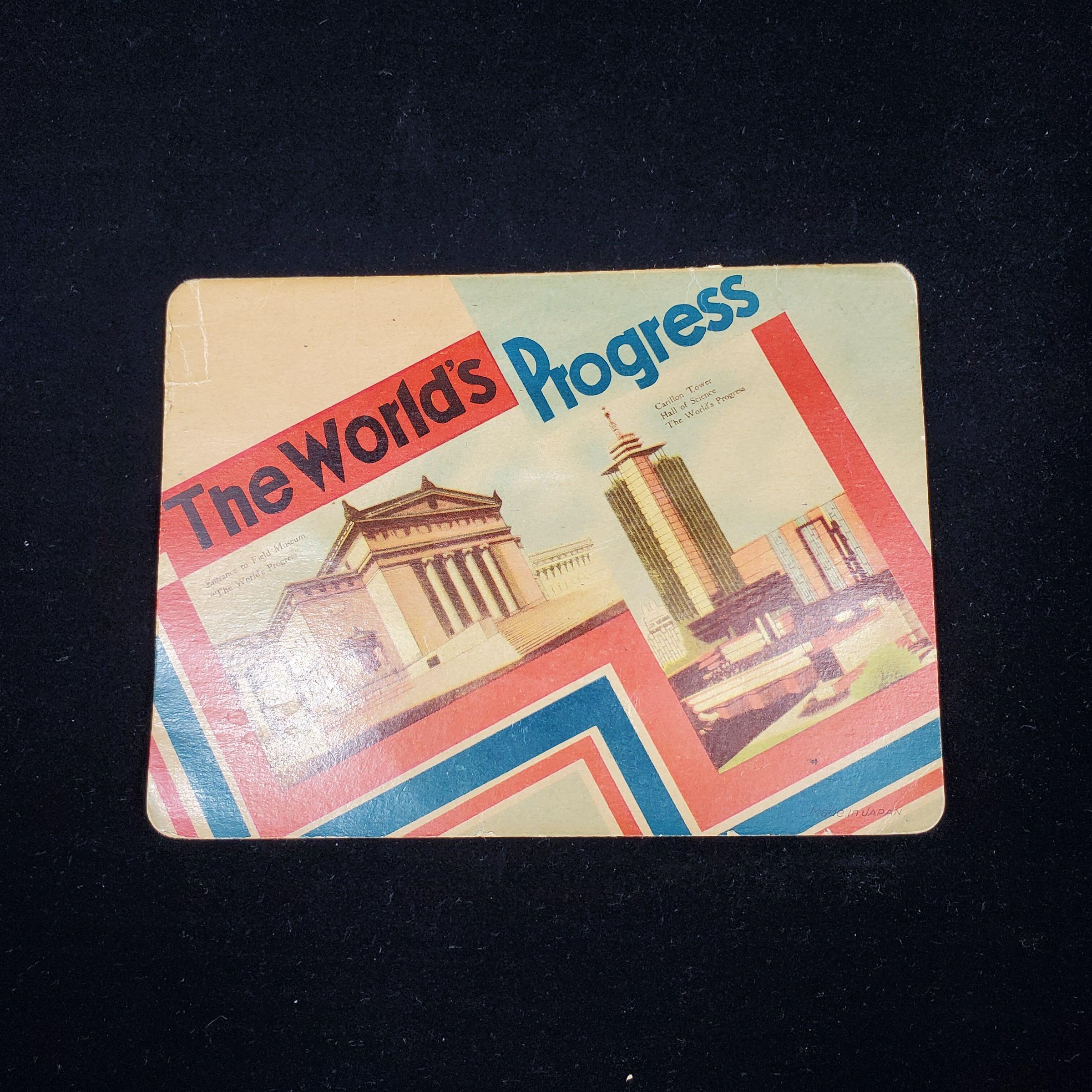 Cardboard needle book. Colours - red,blue. white, shades of brown. Picture on front shows buildings and reads ÒThe WorldÕs ProgressÓ.Back shows more buildings with names. Inside 5 foil backed areas with needles, 1 with needle threader.