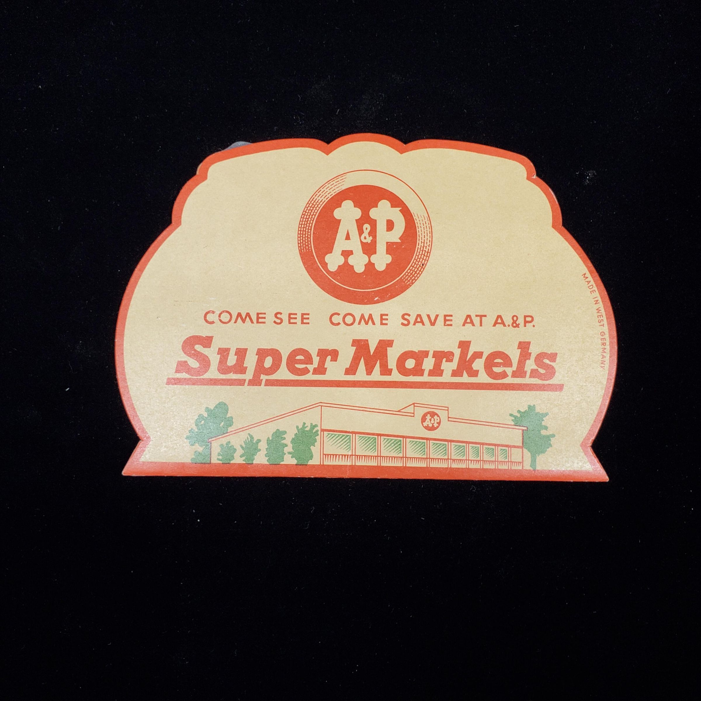 Large cardboard needle book. Advertising. Colours = cream, red, green. Cover shows building and reads ÒA&P Come See Come Save a t A&P Super Market.Ó Back same. Inside 7 foil backed areas for needles- )orobably 6 for needles and 1 for threader)